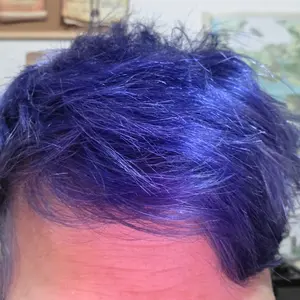 I knew I shouldn’t have bought it but I did so on a whim. This hair dye is truly awful. It fades in three washes and it never shows any purple. It is muted and very matte blue like color with no shifting, which btw I couldn’t understand how that would work on hair anyway. This product is a gimmick.