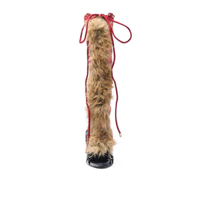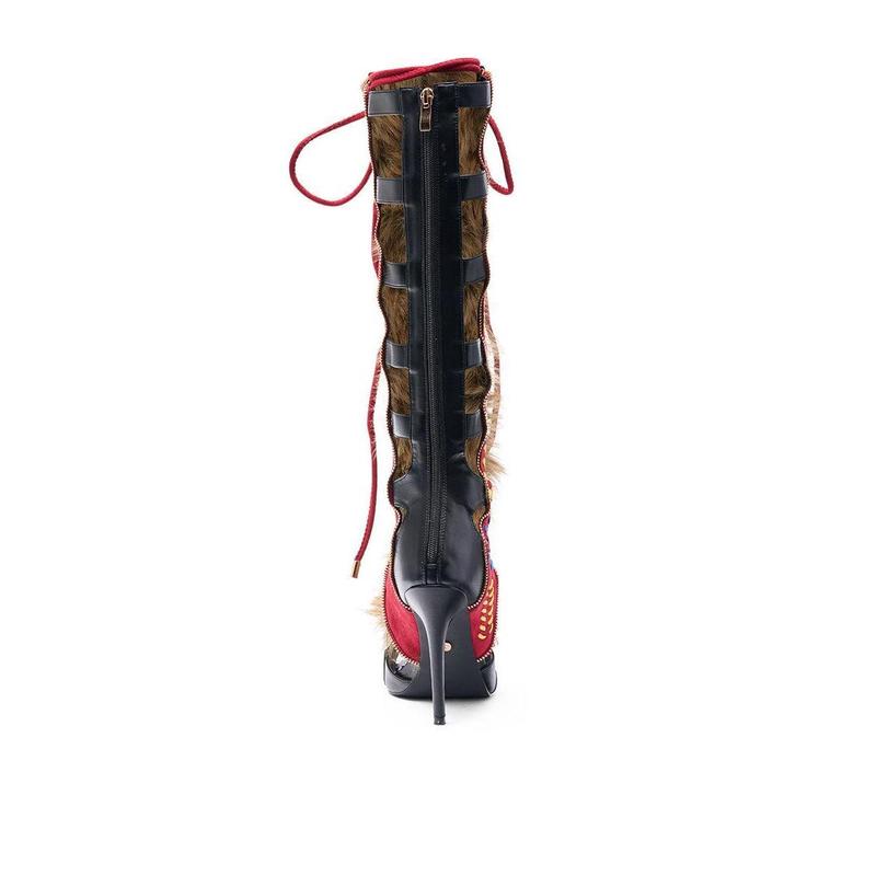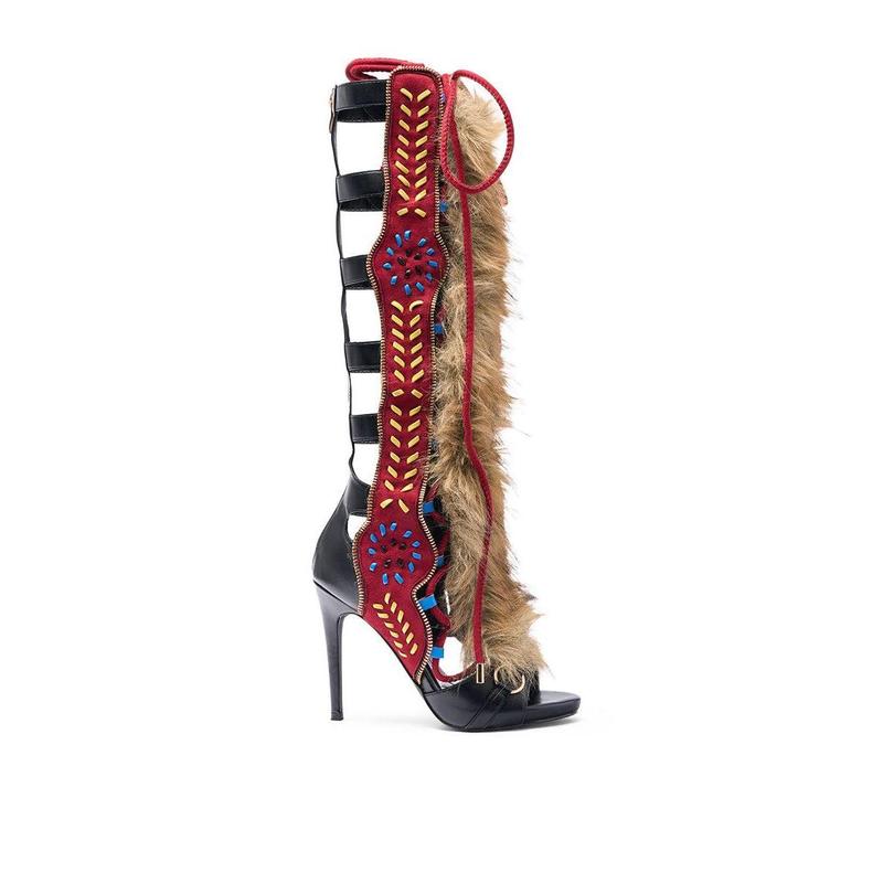 The AZALEA WANG Shaine Black Multi Gladiator Stitch And Fur Sandal is crafted from a sleek faux leather base and showcases a knee-high, gladiator shaft made up of panels of sumptuous red suede with vibrant embroidered detailing and a rope lace-up front lined with cozy faux fur. It also features an open almond toe, a coordinating leather toe band with gold-tone hardware, a slim stiletto heel, and a cushioned insole. Complete with a back zipper closure. Perfect for night-out looks, editorial styling, or winter glam moments, this boot redefines boldness with every strut.–Faux Leather, Faux Suede, Faux Fur Upper- Open Almond Toe- Stiletto Heel- Knee-High Shaft- Imported(all measurements approximate from size 7.5)- 4.5” Heel Height- 15.5” Shaft Height-  17” Shaft Opening Circumference (adjustable)- 13” Calf CircumferenceProduct ID: 1075026