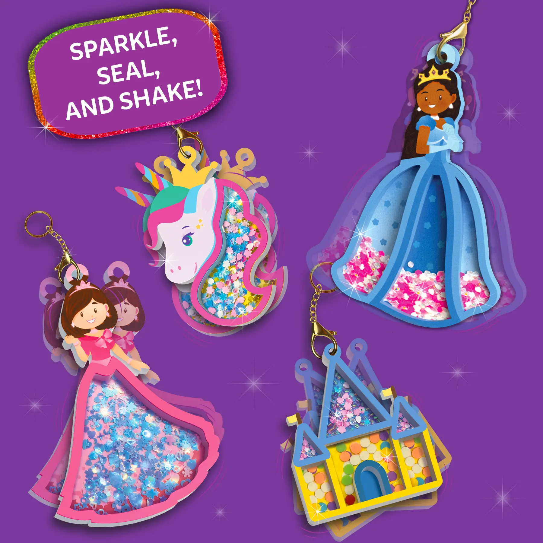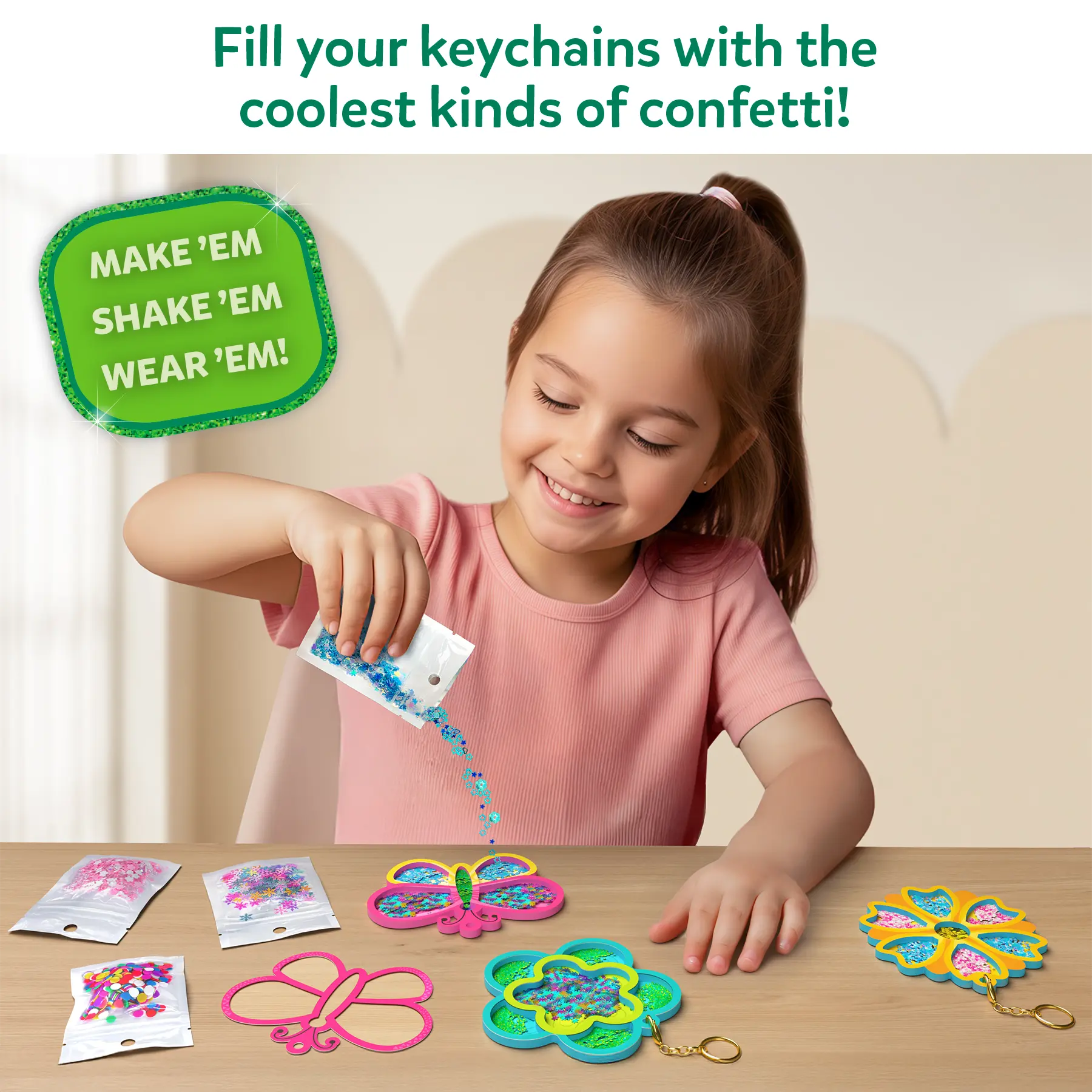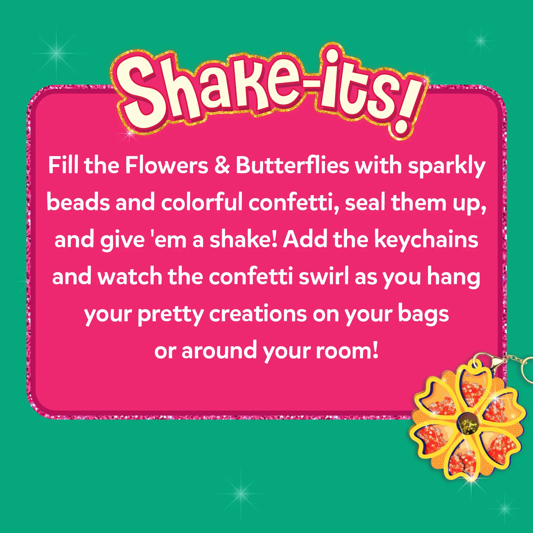·MAKE SHAKE-ITS THAT SPARKLE & SWIRL!: Fill the flowers and butterflies with sparkly beads and colorful confetti, then seal and give 'em a shake! Add the keychains and watch the confetti swirl as you hang your one-of-a-kind creations on bags, backpacks, or around your room.