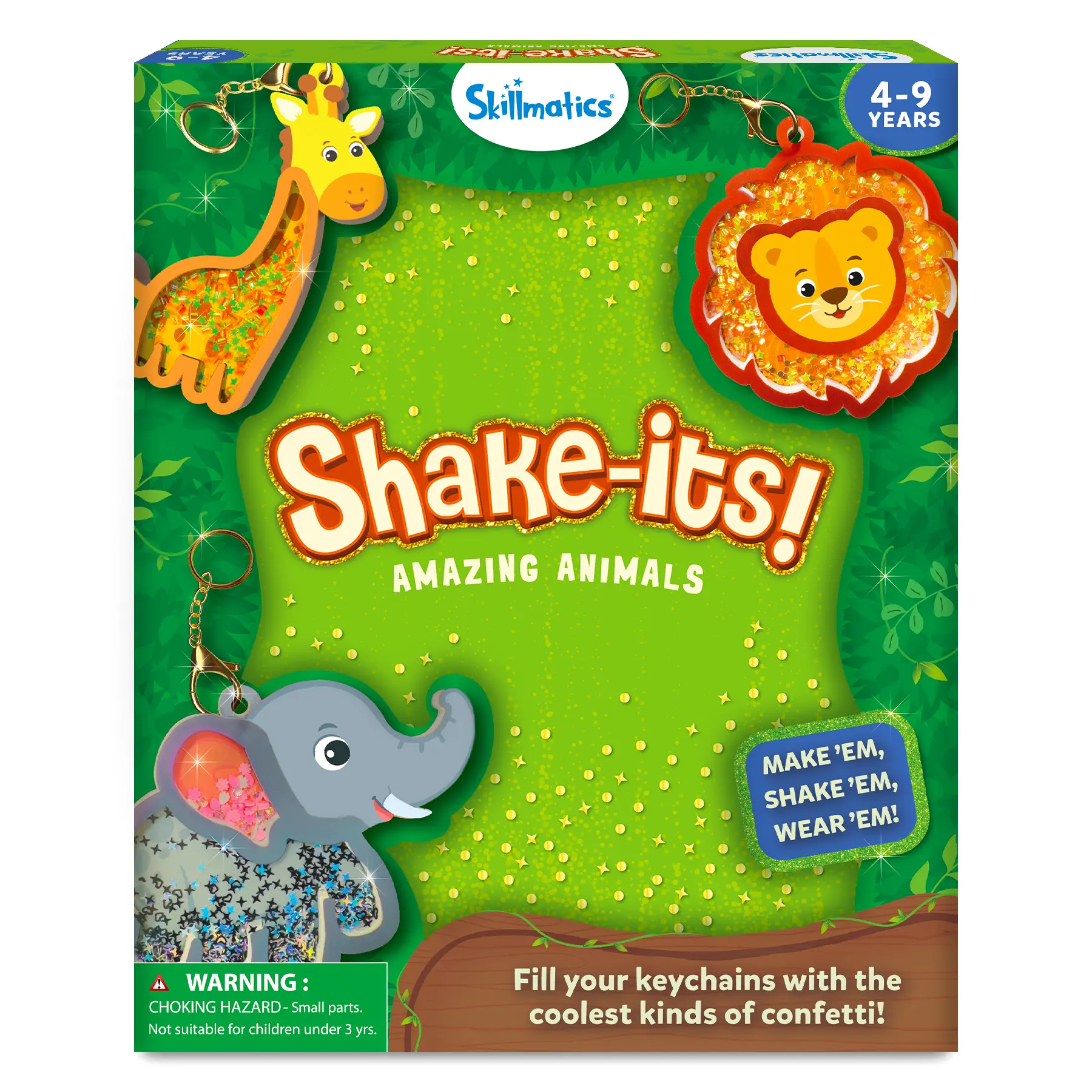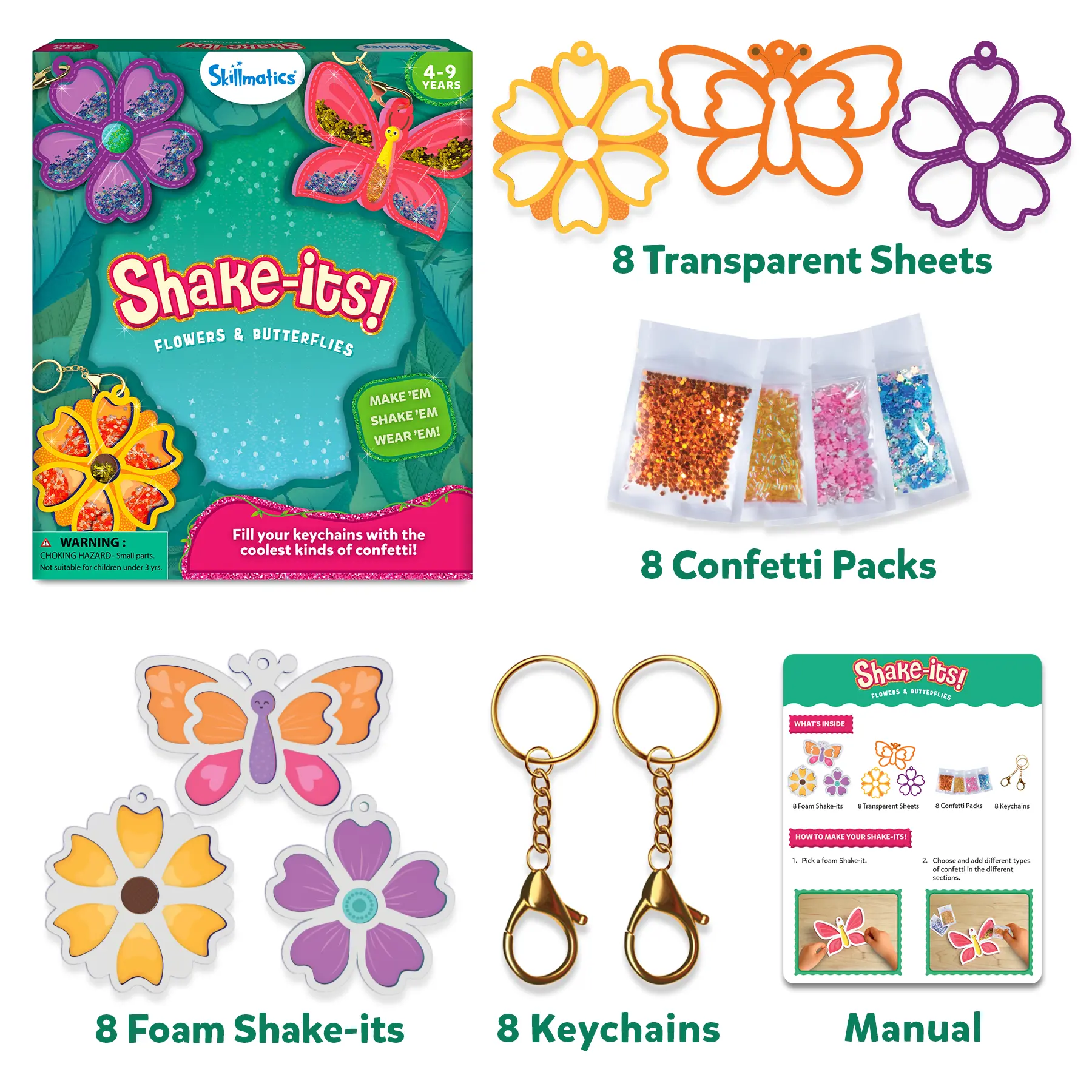 ·INCLUDES: 8 Foam Shake-its, 8 Transparent Sheets, 8 Confetti Packs, 8 Keychains, and an Instruction Manual.