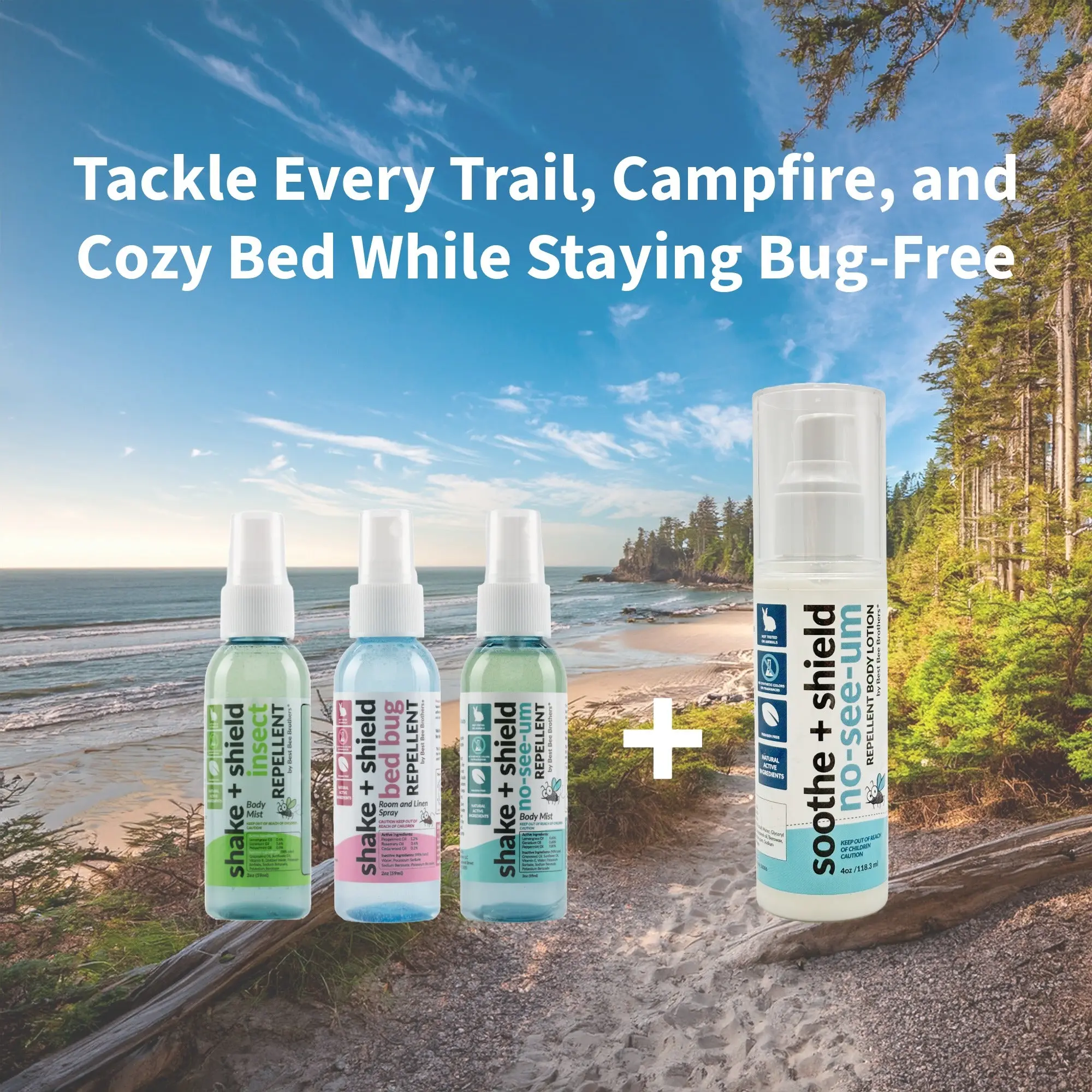 Whether you’re waking up in a tent, heading to a bonfire, or turning in at a college dorm, the Shake + Shield Repellent Sampler Pack has you covered—naturally. This curated bundle includes three of our most effective clean-ingredient repellents, plus a FREE 4oz Soothe + Shield No-See-Um Repelling Lotion (a $16.99 value).