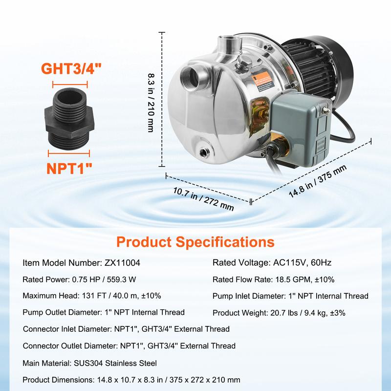 • High-Power, 131ft Head: Introducing our shallow well jet pump with a mighty 0.75 HP / 559.3W motor, engineered to boost water flow effortlessly. With a remarkable rated flow rate of 18.5 GPM, it reaches heights up to 131 FT / 40 m, exceeding expectations for household water needs. Say hello to superior performance and bid farewell to water worries!