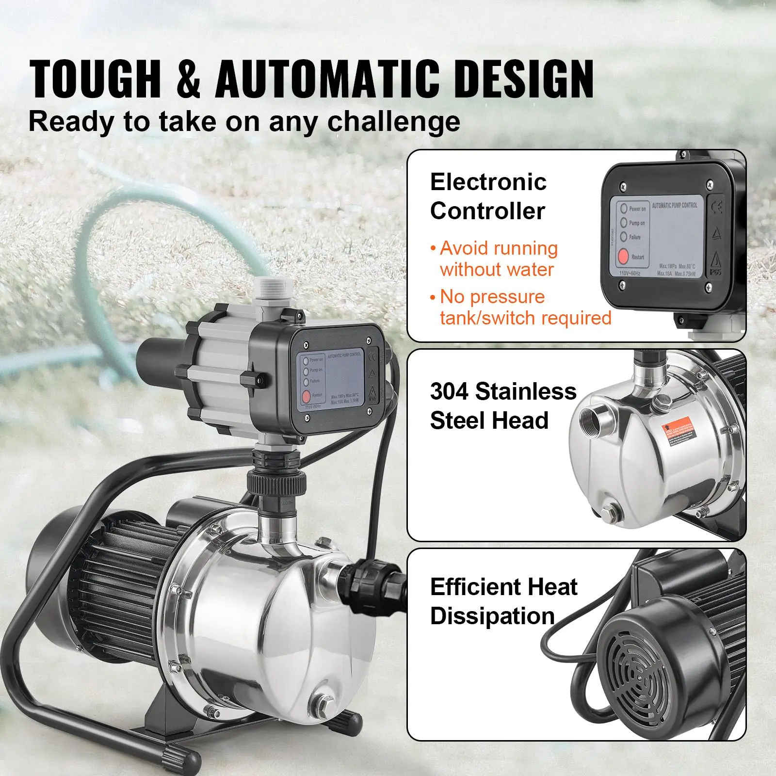 • 1HP Powerful Garden Pump: Max Pressure: 87 psi; Max Suction: 26.2 ft. This shallow well pump has a powerful 1HP motor, providing 23 GPM max flow and 145 ft max head. The pump can boost home water pressure with an electronic controller to ensure automatic work and prevent dry running. Whether you're in the shower or using the faucet, this powerful pressure booster will keep your water pressure going strong.