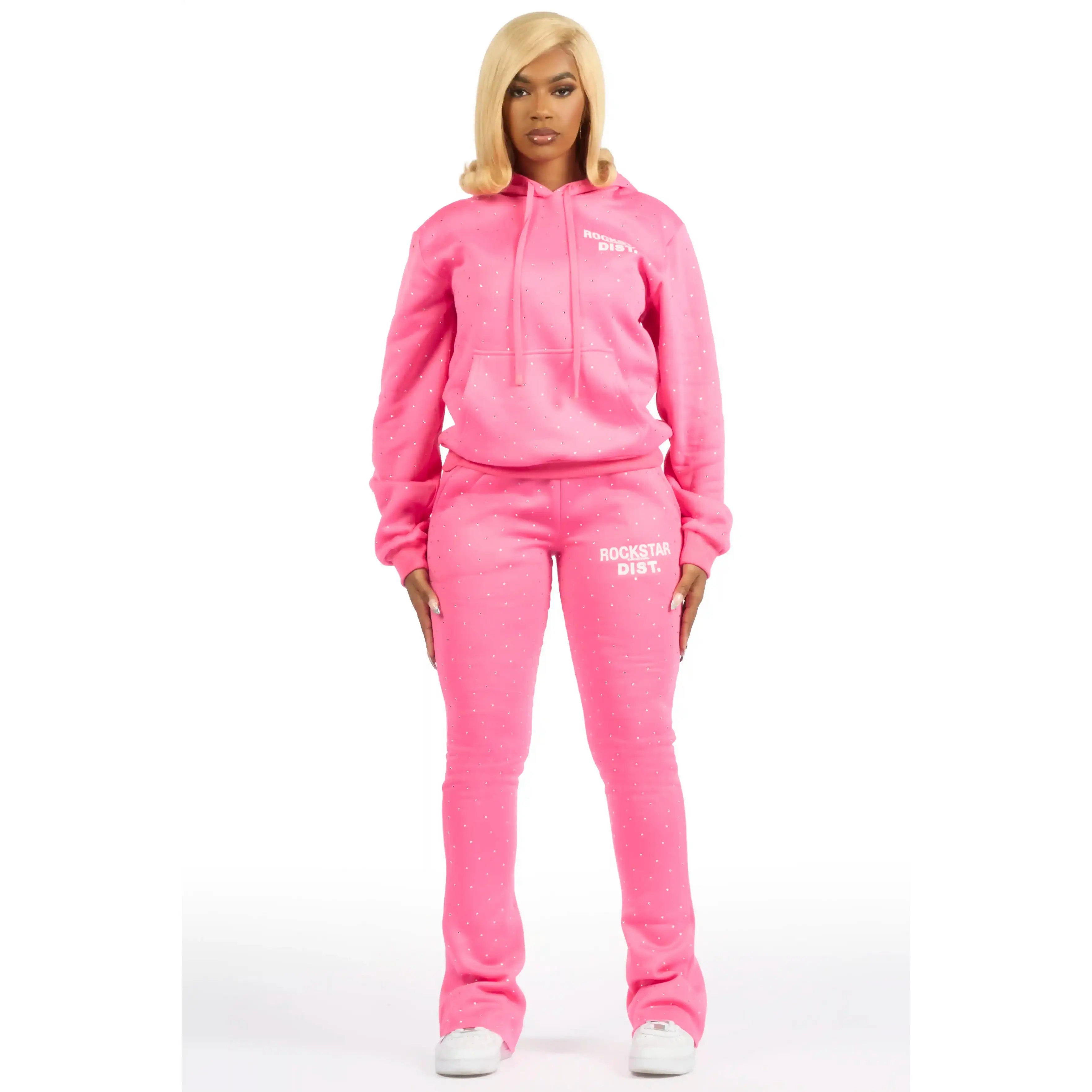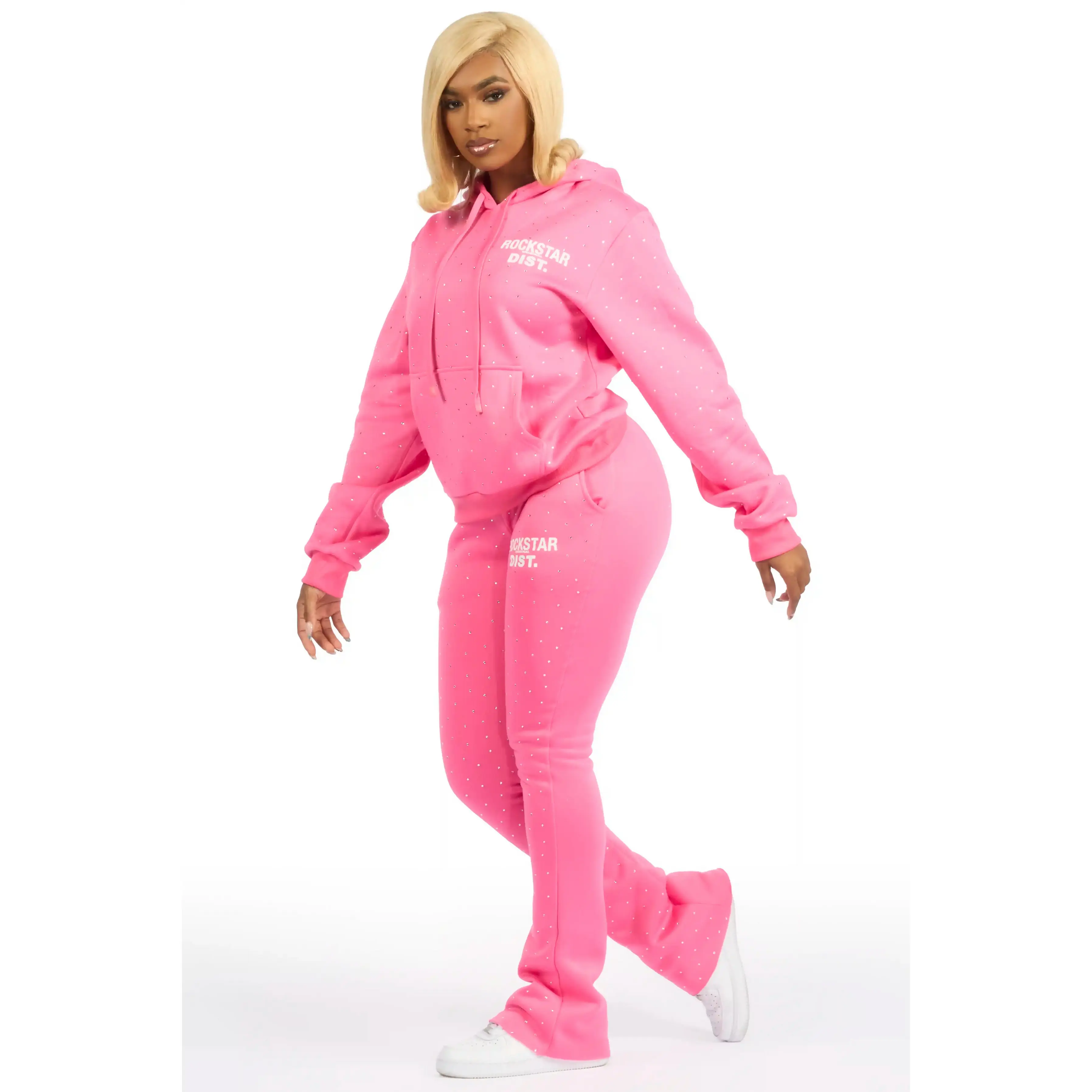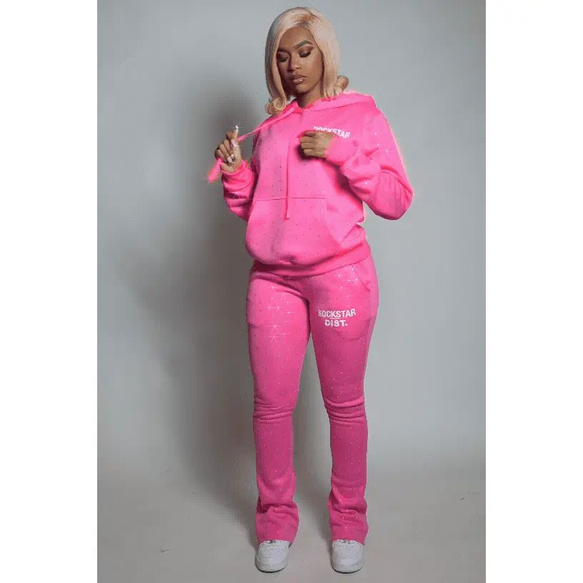 An urban two-piece hoodie and stack track pant set for women in bubblegum pink. Designed with extra long legs and custom detailing for a gorgeous streetwear essential.