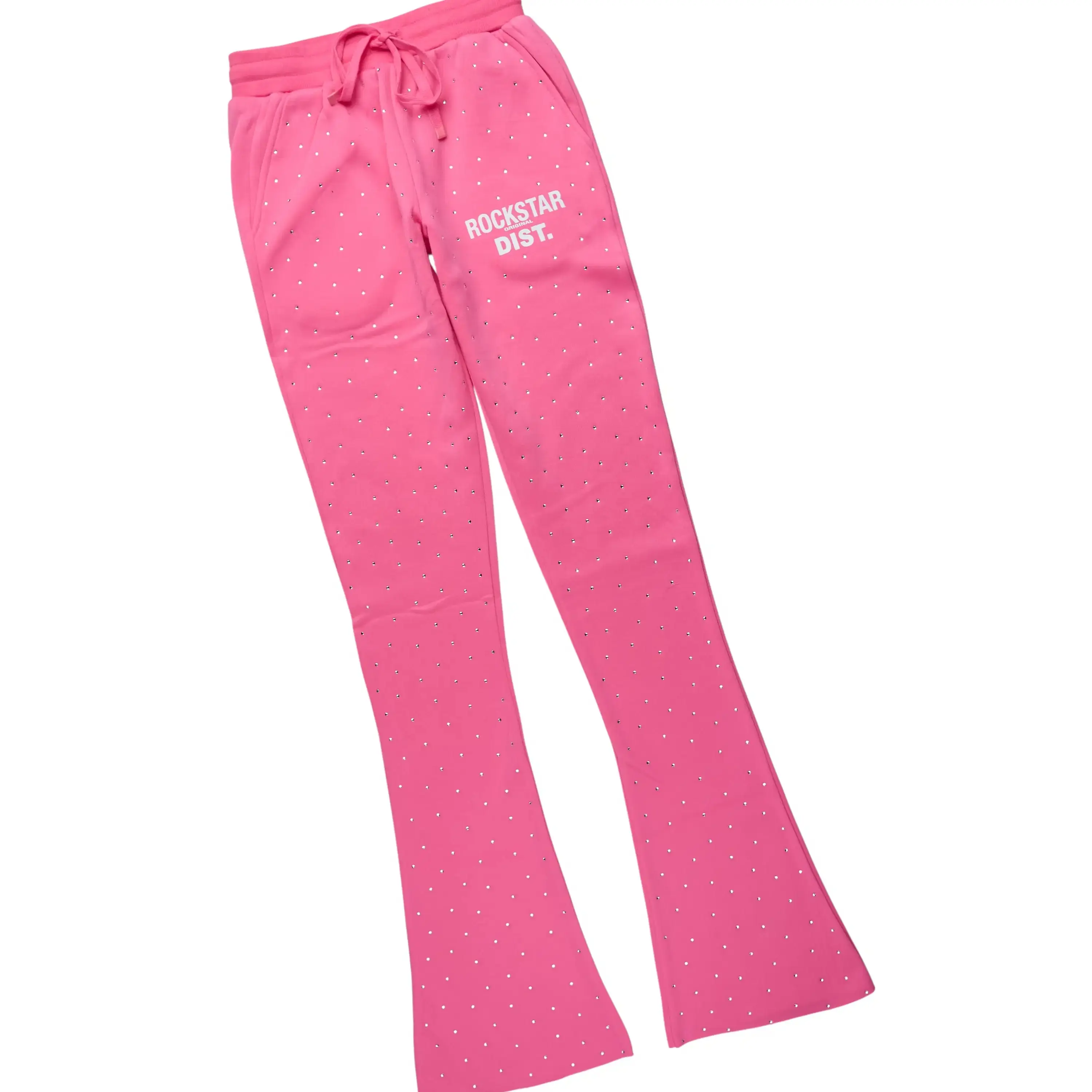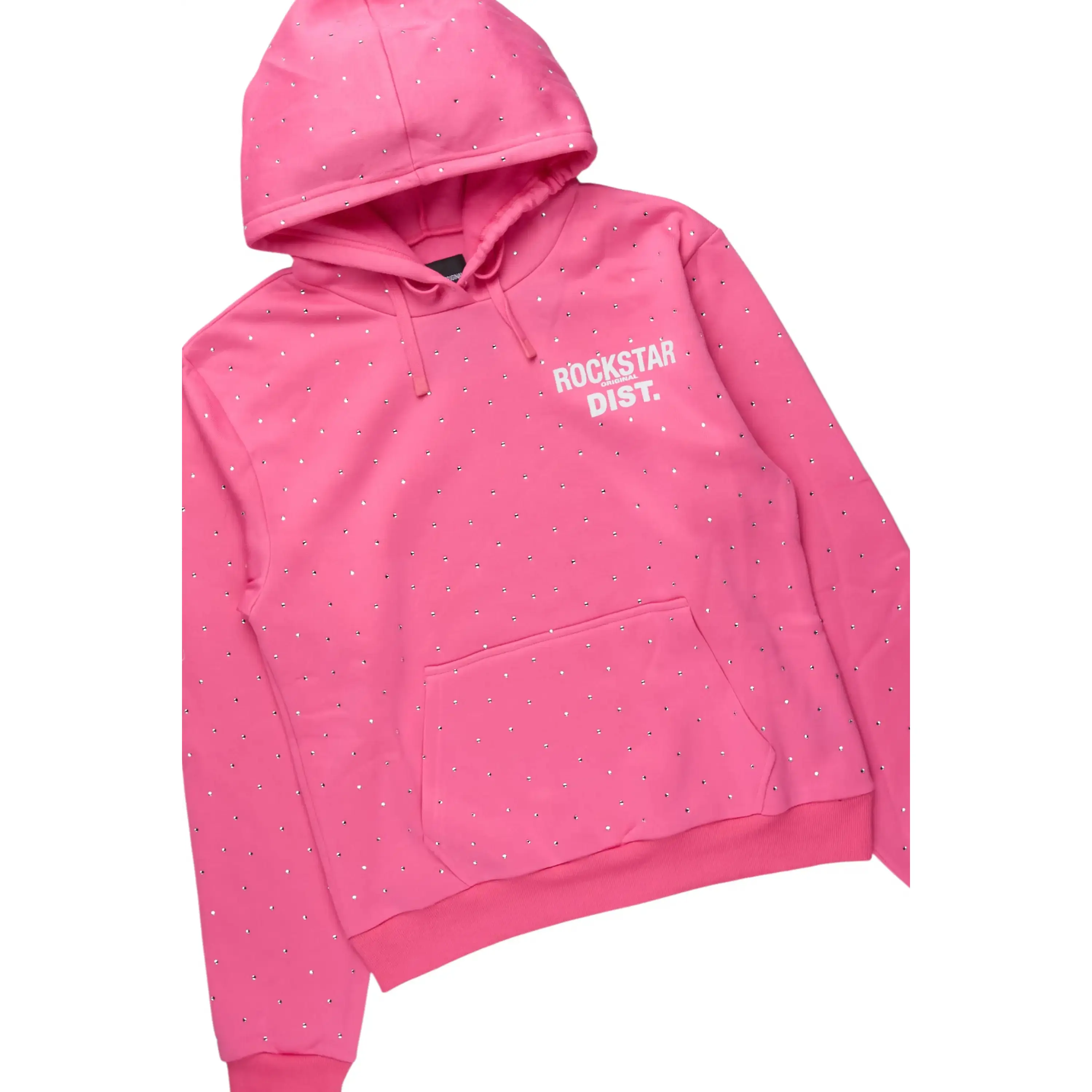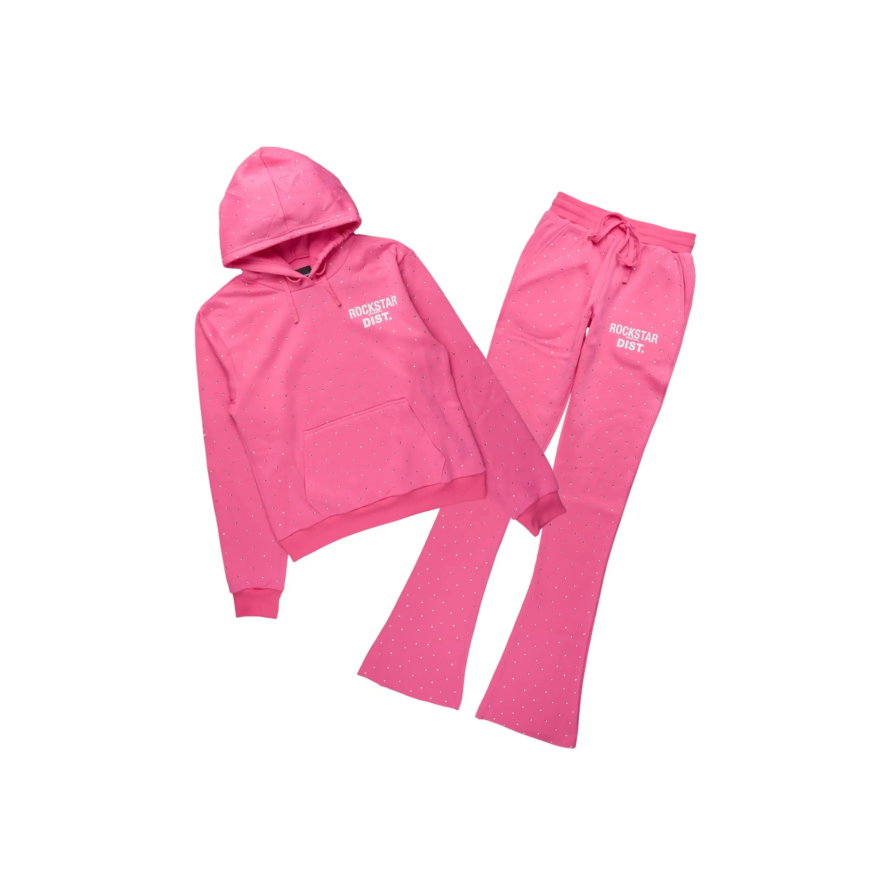 An urban two-piece hoodie and stack track pant set for women in bubblegum pink. Designed with extra long legs and custom detailing for a gorgeous streetwear essential.