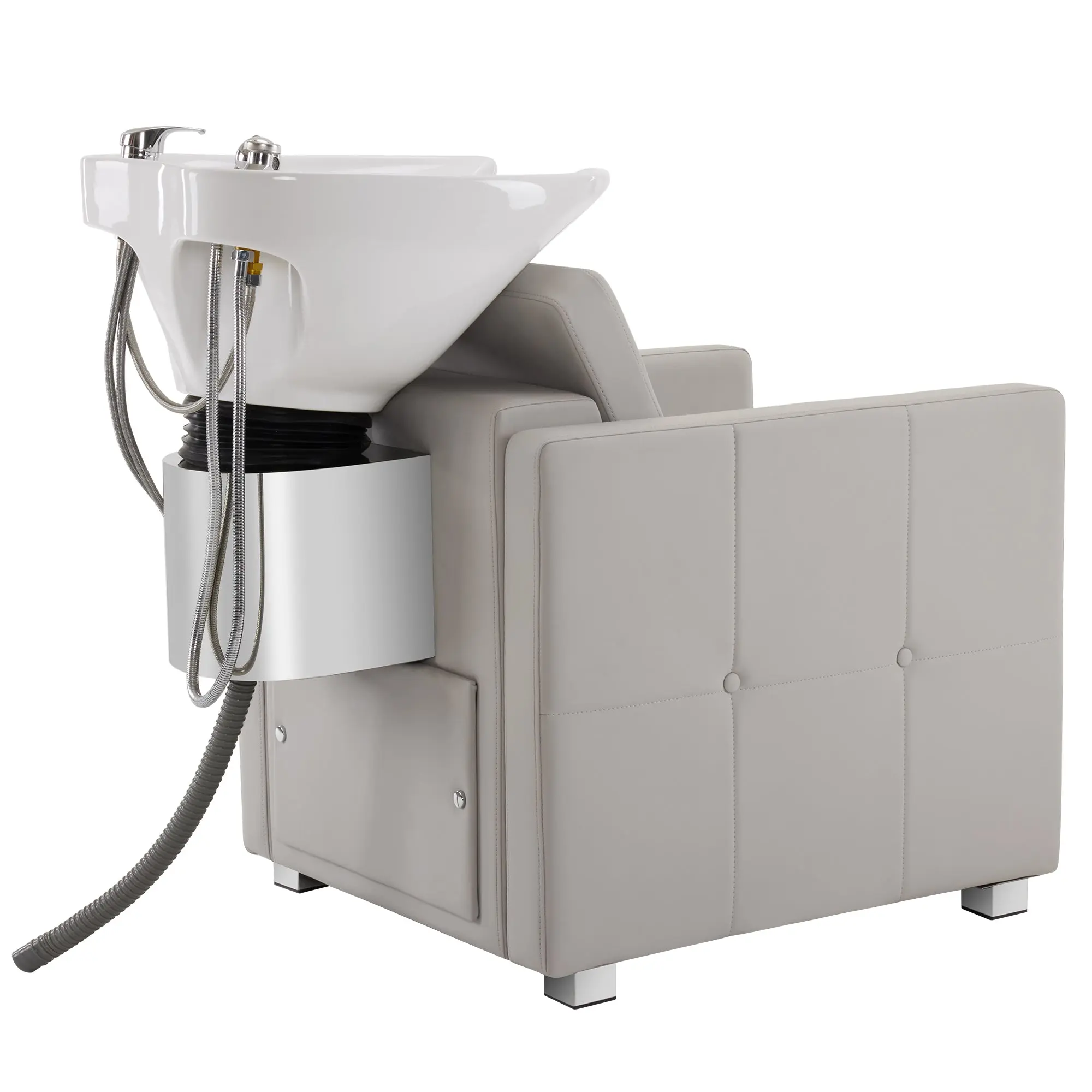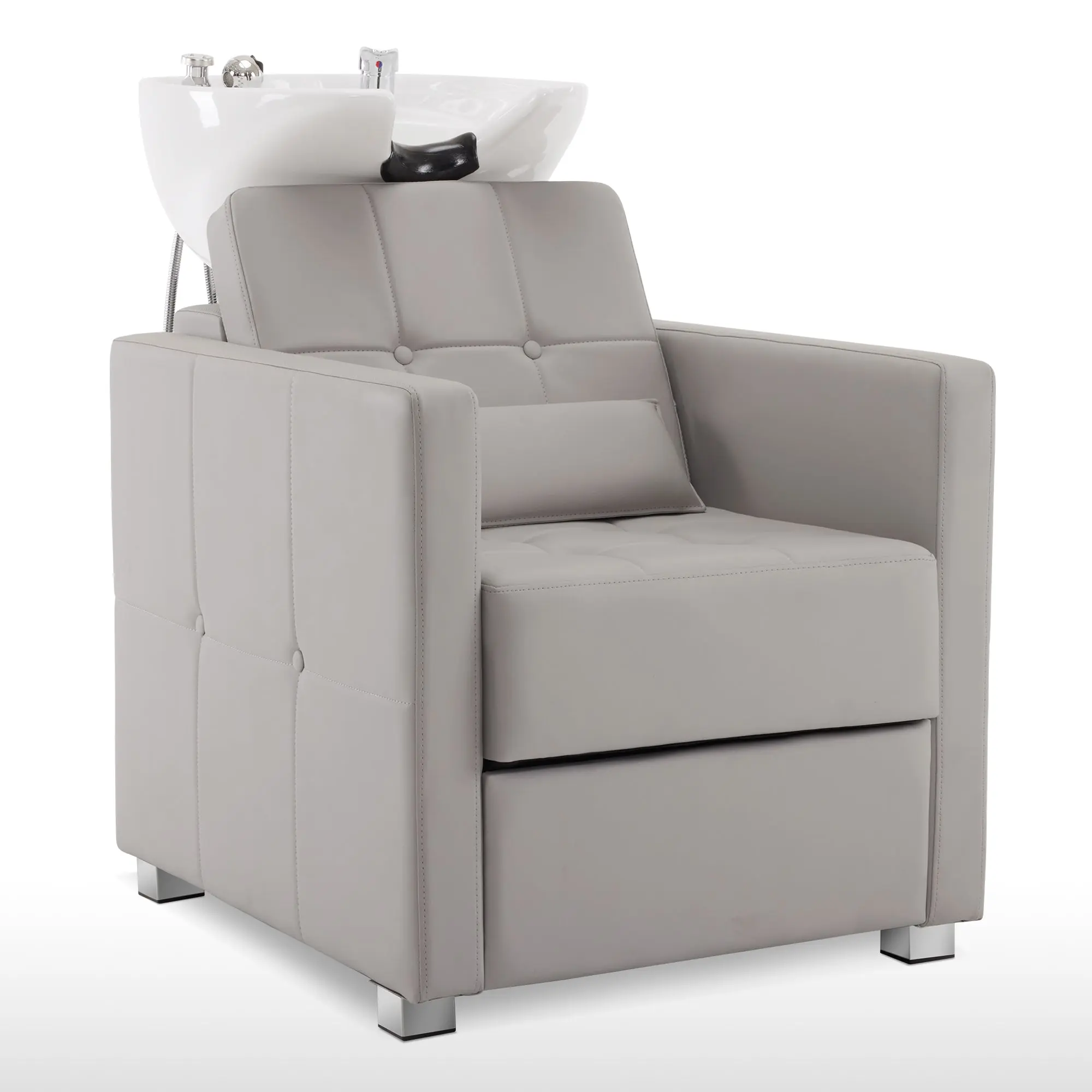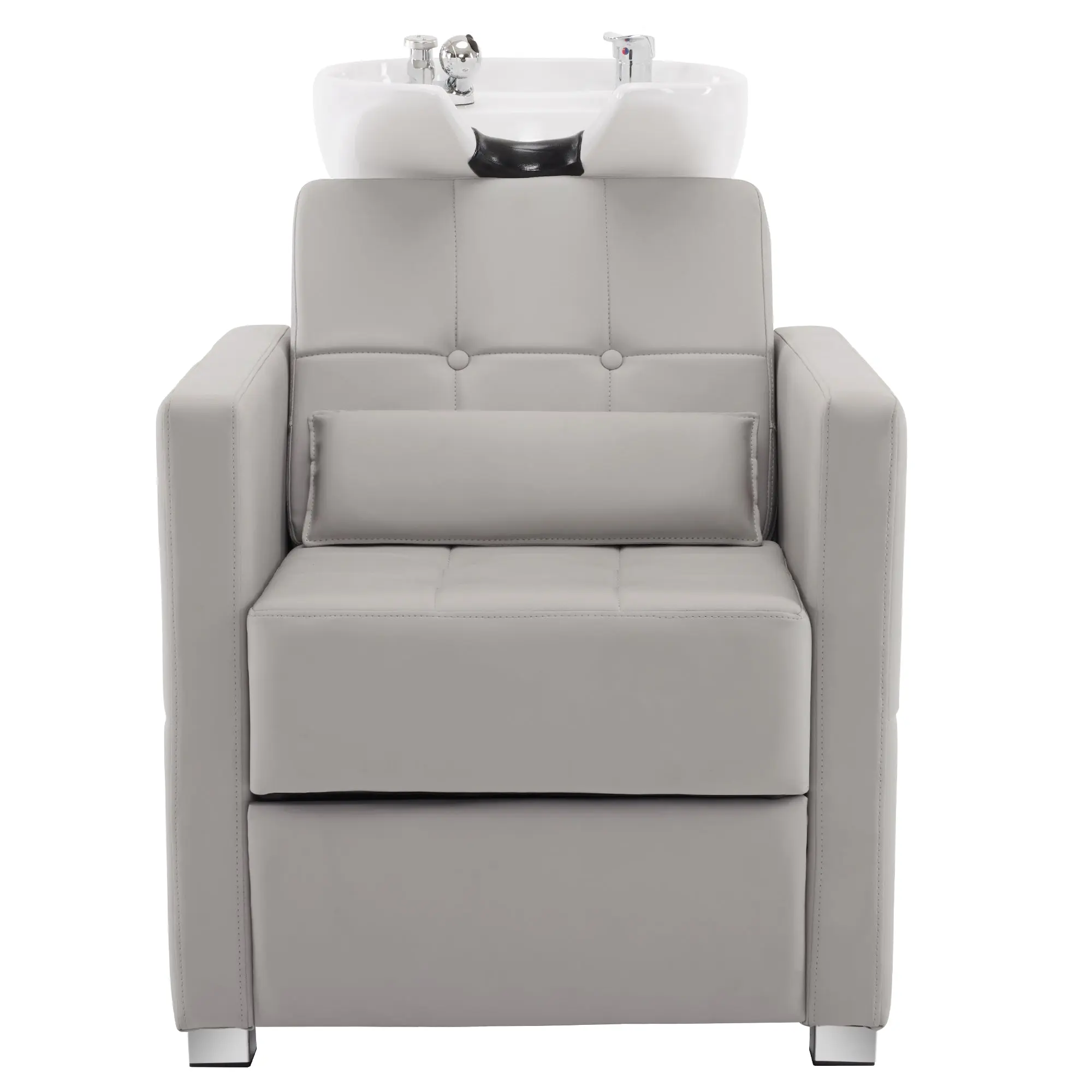 This shampoo station chair features its simple business style with good quality and comfort. The suture texture with plaid and button highlights its classic business appearance. Its thickened seat cushion and independent lumbar pillow with ergonomic design can provide a better experience for your clients. The classic shampoo chair is also suitable for barbershops, hair salons, and spa salon centers of different styles.