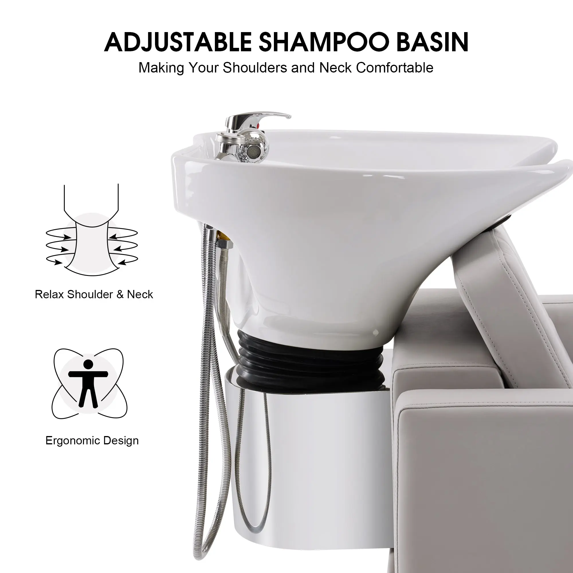 ·Ergonomic Design: A comfortable angle of 142° is designed for better relaxation. The lumbar pillow is independent, so you can remove it if needed. The tilting angle of the shampoo bowl can be adjusted to make clients’ shoulders and necks more comfortable.