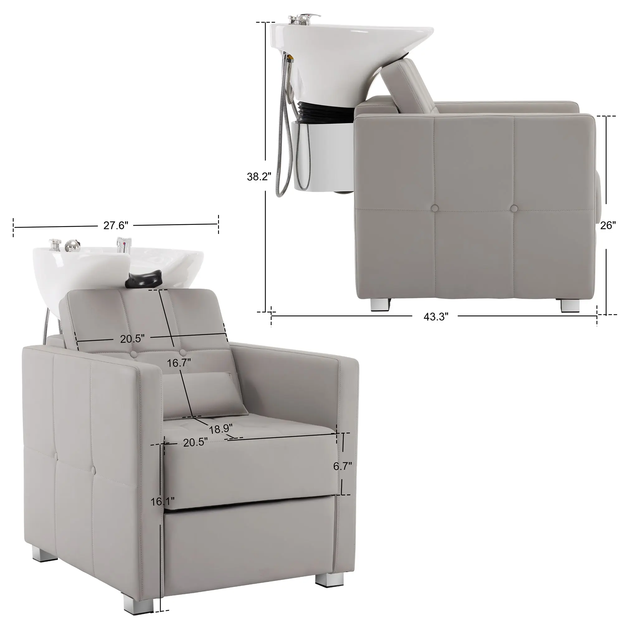 ·Classic Design: This backwash barber chair features a classic design and color scheme. The plaid and decorative buttons on the leather make its appearance more classic. Its color scheme of business style-black chair equipped with dark bowl and the grey chair equipped with white bowl-will catch people’s eyes.