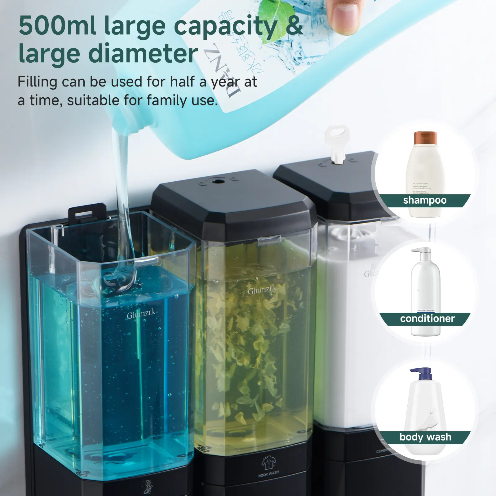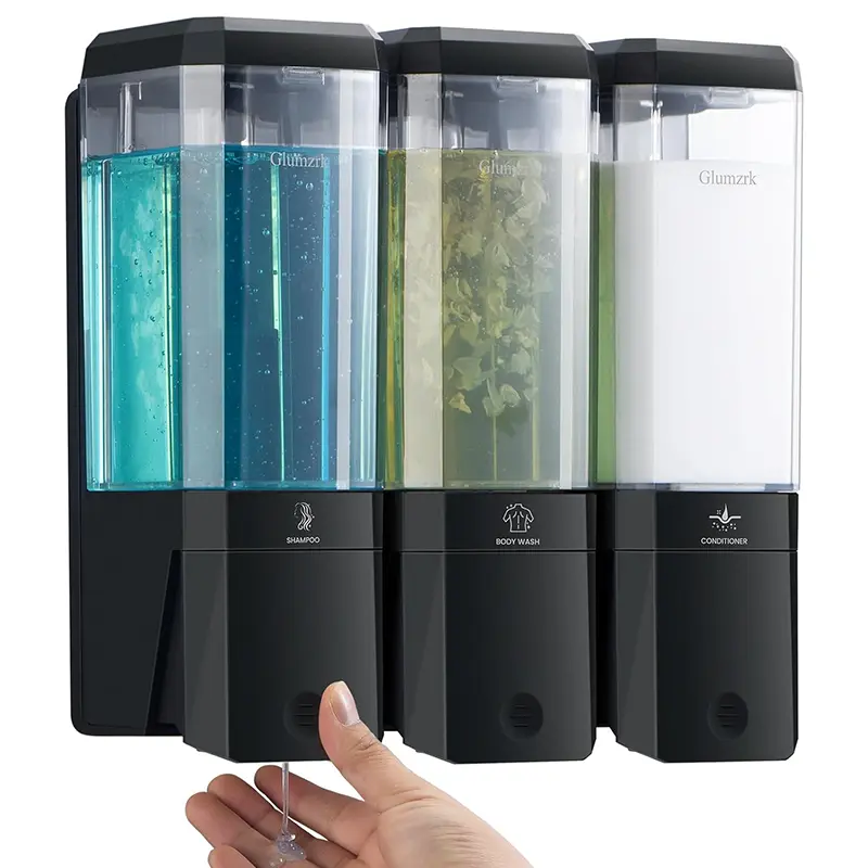 ·Space-Saving Design: Glumzrk wall-mounted shower soap dispenser organizes all your essentials—shampoo,body wash, conditioner,and shower gel freeing up bathroom counter space.Install reusable shampoo dispenser for shower to be more environmentally friendly.