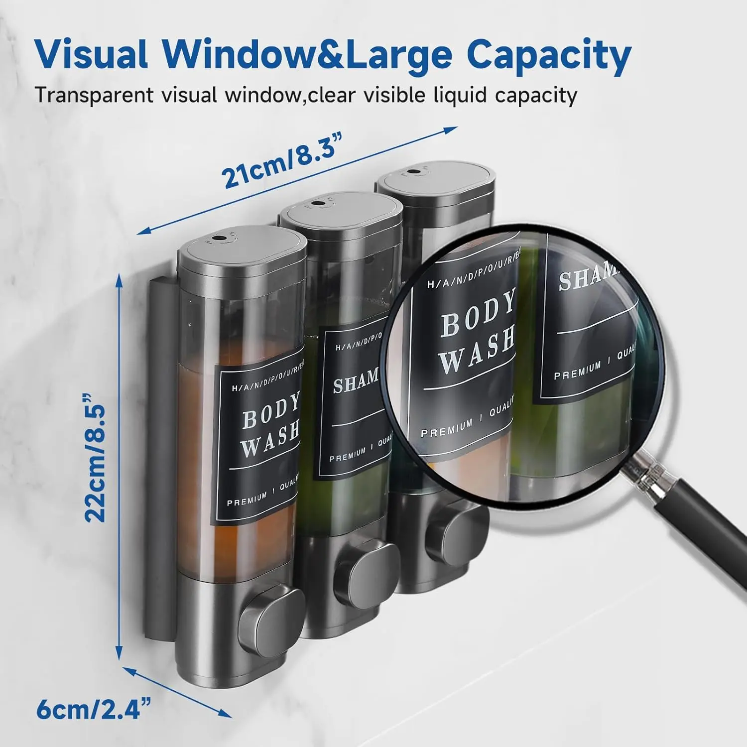 ·HIGH-CAPACITY--Show shampoo dispense holds 300 ML/12.85 US (each Chamber), easy to refill with soap liquid; Transparent visual window,easy to know the liquid amount clearly and replenish shampoo in time; Large button is easy to release liquid, dispense appropriate amount of liquid each time, No leakage& save shampoo.