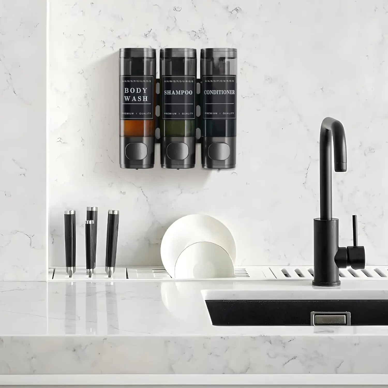 ·FRIENDLY MATERIAL--The shower dispenser is made of anti drop ABS material, super sturdy and durable, heat-resistant, not easily deformed, corrosion-resistant, not rusty, waterproof, wear-resistant, easy to clean. In addition, the wall mounted shower soap dispenser is lighter and less prone to falling when hung on the wall, and can be pressed more than 500000+ times.