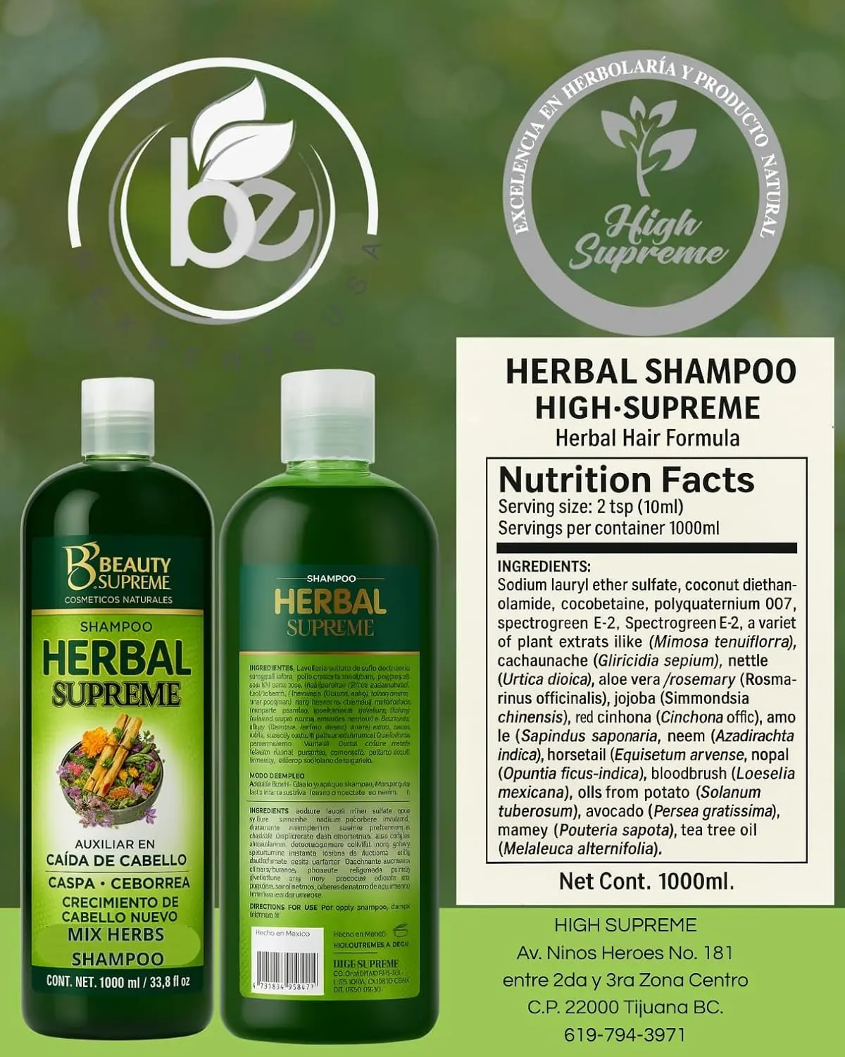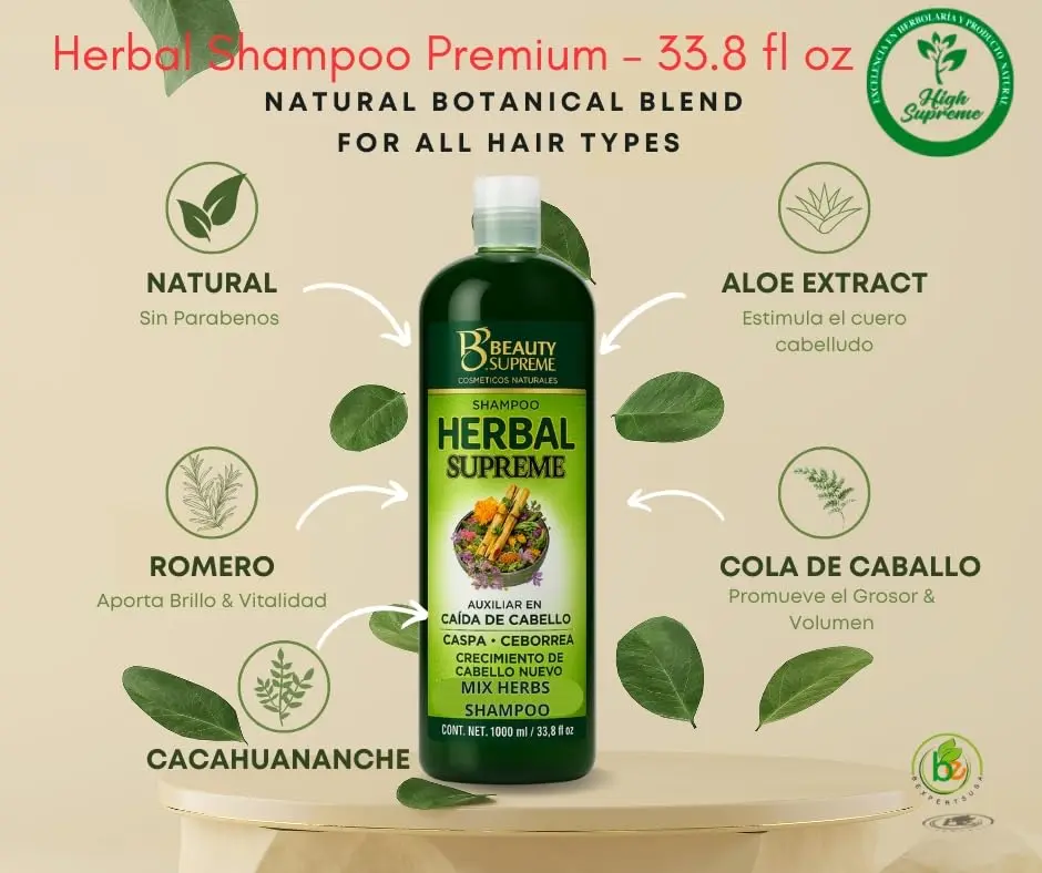 HERBAL Supreme Shampoo 33.8 fl oz | Cacahuananche, Rosemary, Aloe, Neem, Horsetail, Nettle, Tepezcohuite & More Natural Herbs Elevate your hair care routine with HERBAL Supreme Shampoo, a nourishing blend of natural ingredients including cacahuananche, rosemary, aloe vera, neem, horsetail, nettle, tepezcohuite, and more.