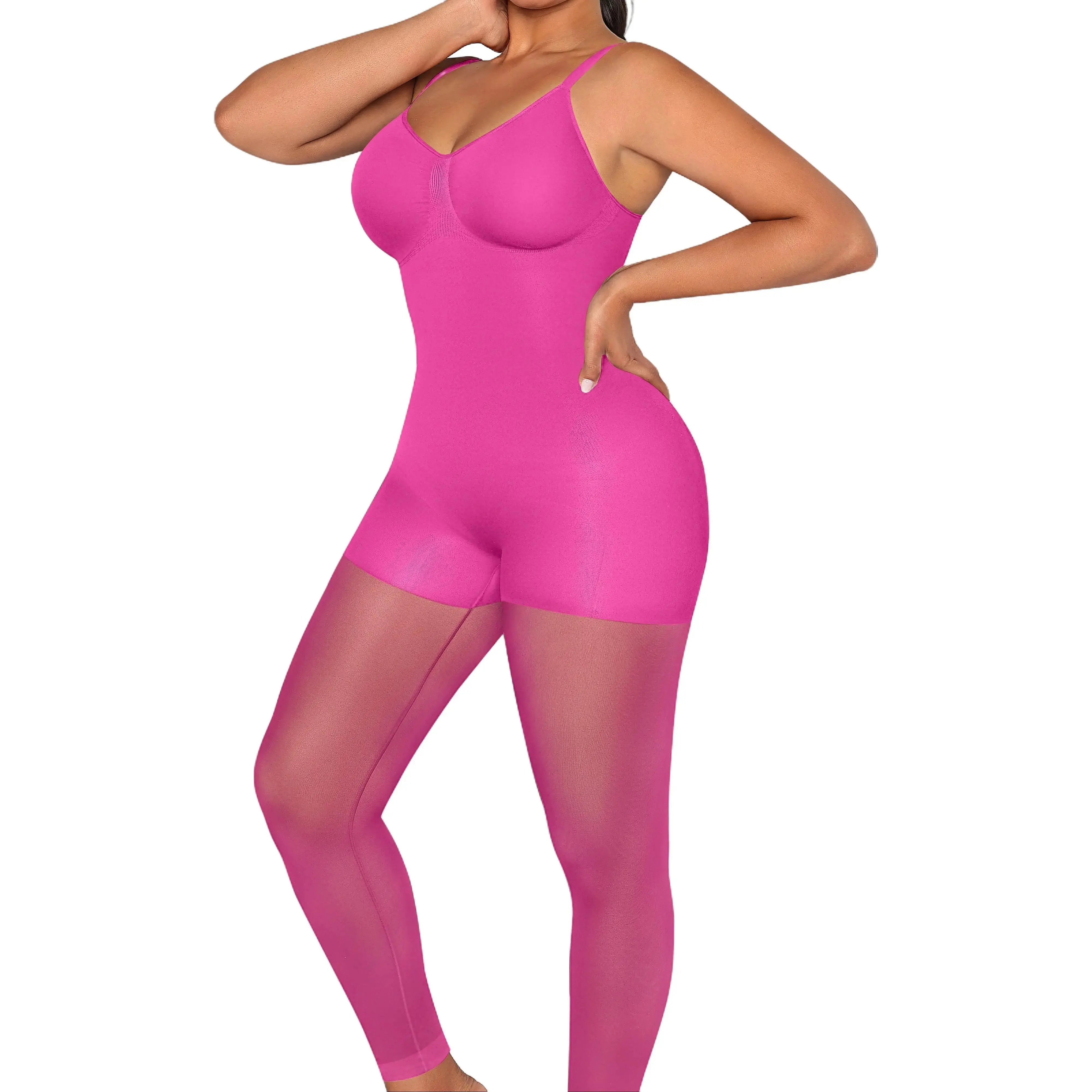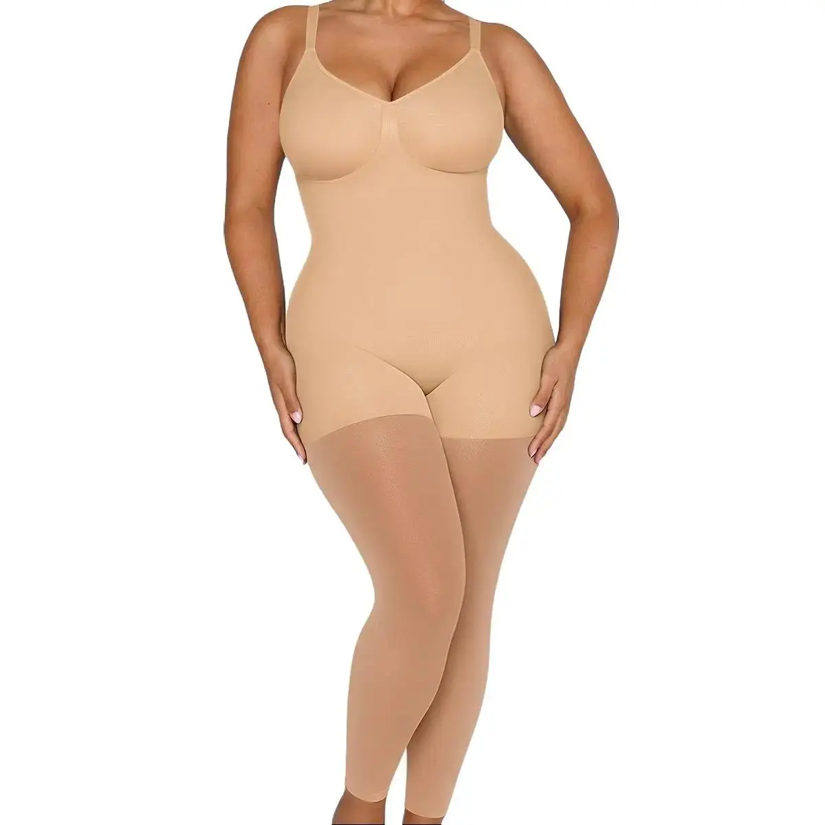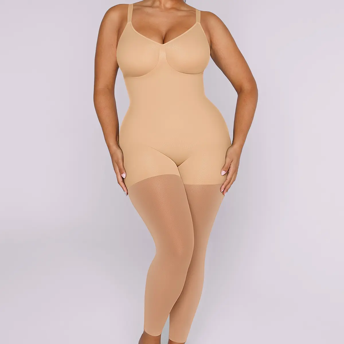 • The mid-thigh shaper seamlessly extends into breathable sheer mesh for precision sculpting.