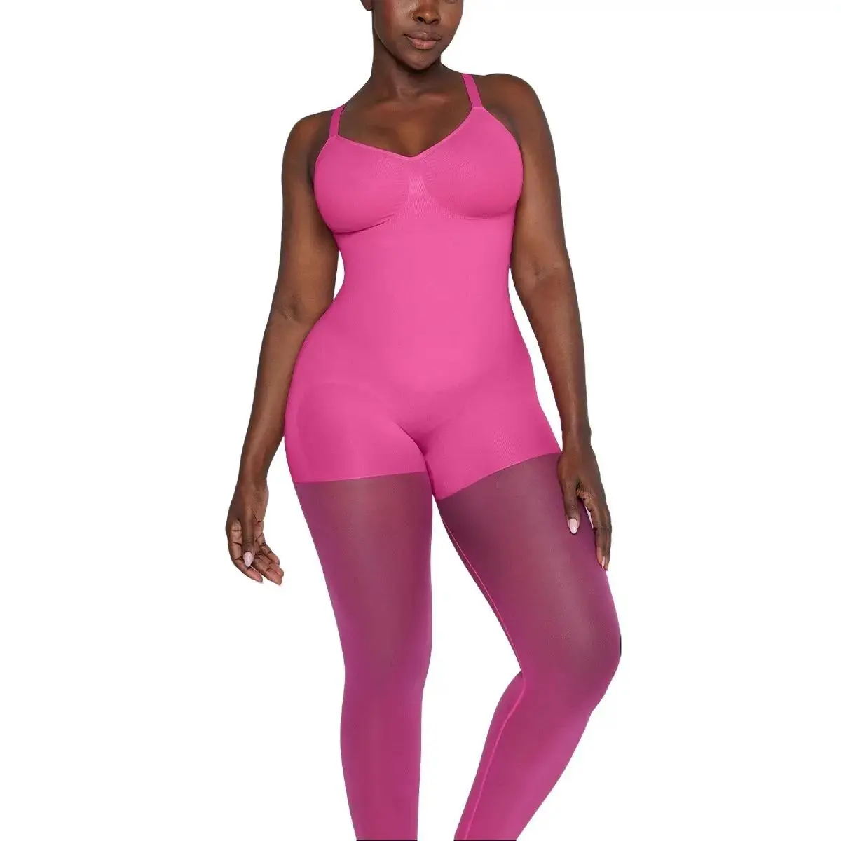 • Targeted compression with structured fabric flattens the stomach, lifts the glutes, and smooths the thighs.