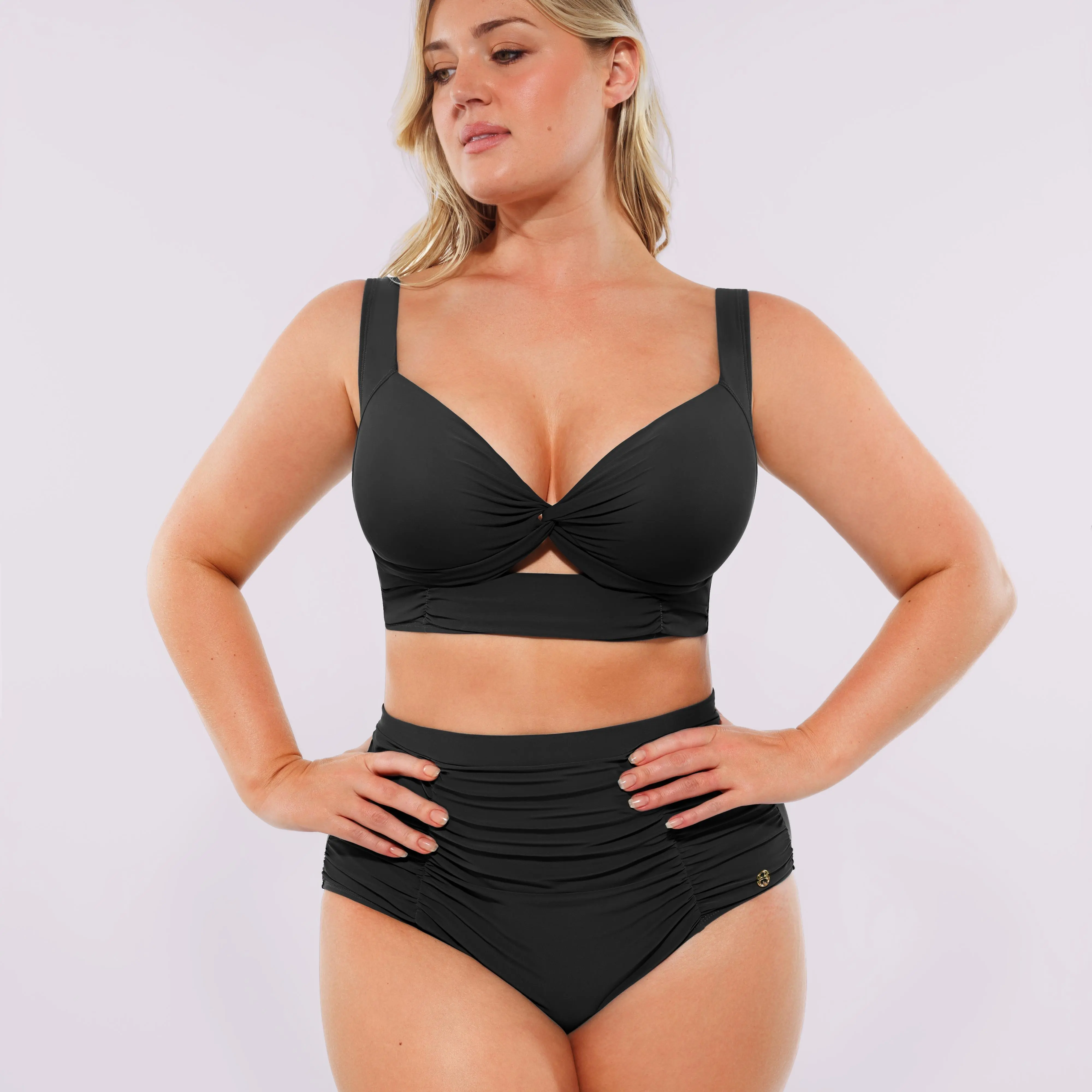 This high-waisted swim set is designed to flatter and sculpt your silhouette. The top features a bust-defining crisscross design and convertible straps for versatile styling, while the high-waisted brief elongates the waist with strategic draping. Both pieces are crafted with inner shaping panels for smooth contouring and feature our signature “SX” metal logo for subtle sophistication. Made from a supportive and stretchy fabric blend, this set offers all-day comfort and a confidence-boosting fit, perfect for any occasion.