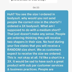 I purchased this item on a live. There was a special, buy bodysuit and get shaper shorts for free. I received the 3X bodysuit, but a M/L shaper short?! The bodysuit fit amazing. I reached out to seller and received a response stating that their system selects a random short. Like, what? Color I can understand but SIZE? What am I supposed to do with a short 4 sizes too small. I am hoping for a sensible resolution. See my conversation in the pictures.
