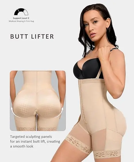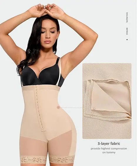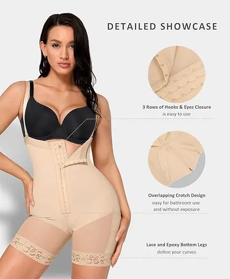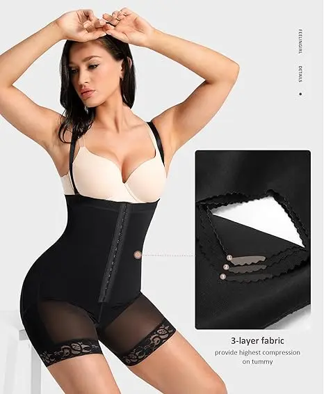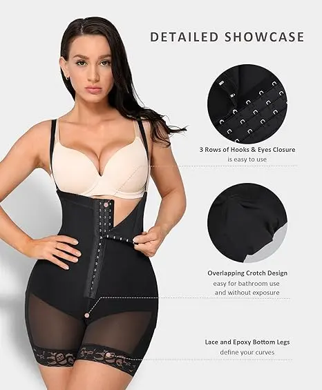 Our shapewear boasts a convenient overlapping crotch design, allowing for easy restroom use without the need to remove the entire garment. The mid-thigh length aids in slimming the legs, while the open-bust design enables you to wear your preferred bra. Featuring three layers in the front, our tummy control shapewear offers gentle compression, effectively shaping and slimming your midsection, instantly enhancing your waistline, and accentuating your natural curves.