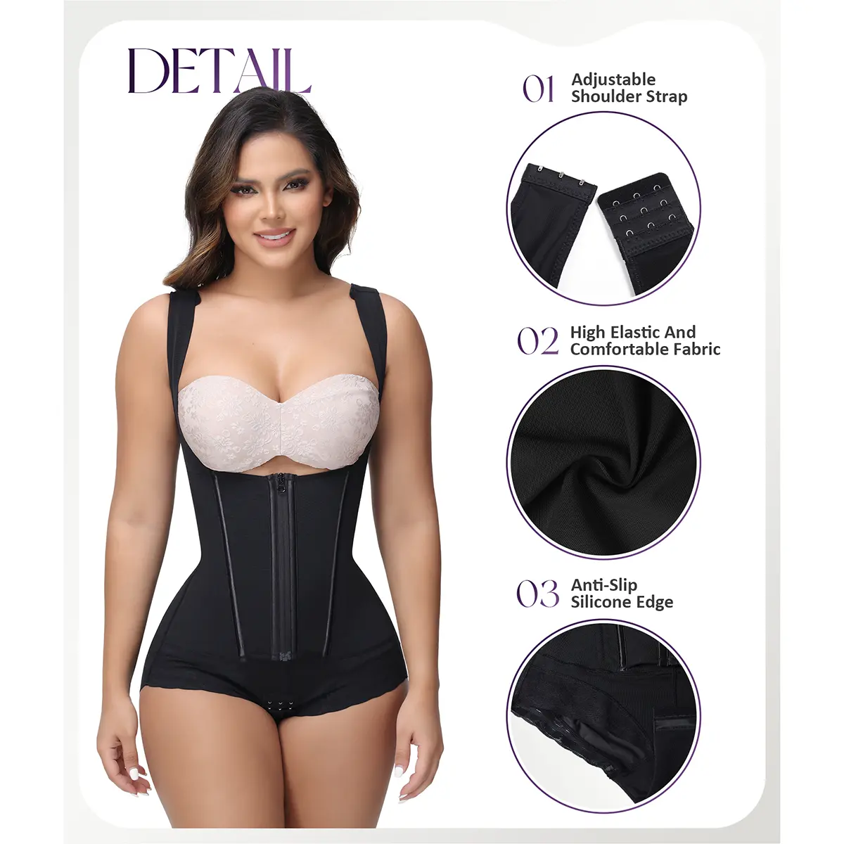 The inner side of the leg lace of the fajas shapewear has non-slip silicone edges to prevent curling.