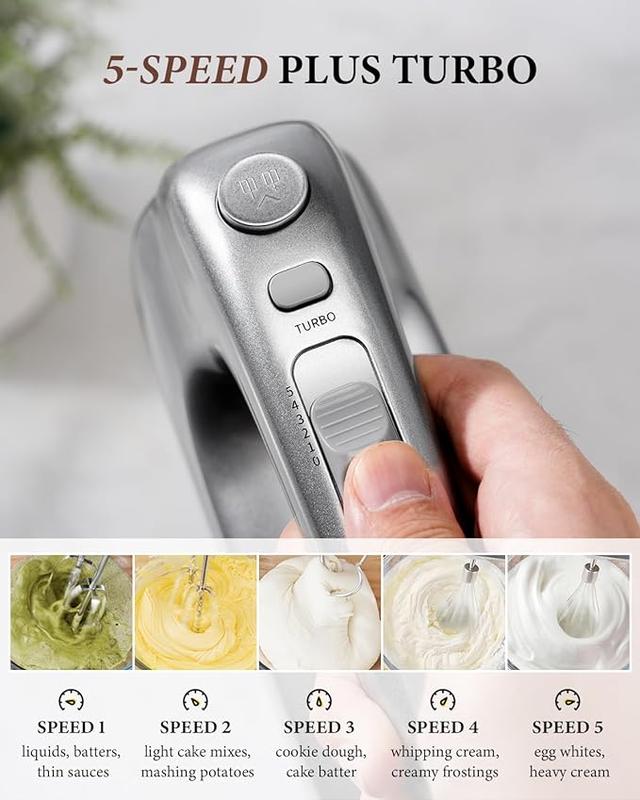 ·【Versatile Stainless Steel Attachments】: The included 5 stainless steel attachments, including 2 beaters, 2 dough hooks, and 1 whisk, cater to various mixing tasks, from whipping cream to kneading dough.
