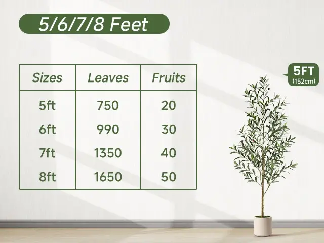 This 5/6/7 feet tall artificial olive tree is made of realistic branches and exquisite fruit. It's designed with reasonable home aesthetics, providing comfort and enhancing your living space's appeal. The tree's lifelike appearance makes it a perfect addition to any room, creating a natural and comfortable atmosphere. 🌳