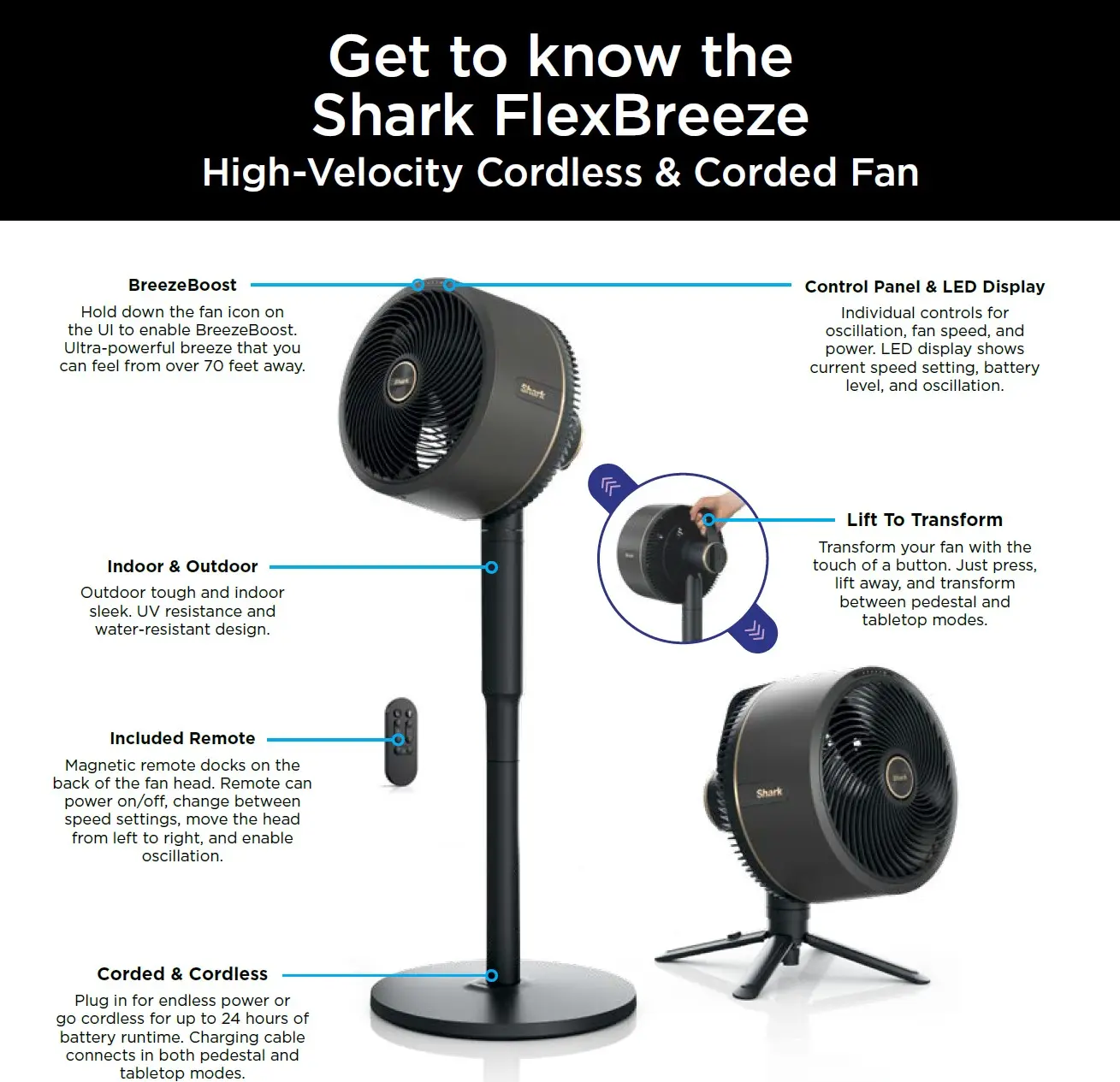 Meet the Ultra-powerful Shark FlexBreeze Outdoor & Indoor Fan with InstaCool Misting attachment. It’s Cordless & corded and transforms from pedestal to tabletop. Incredibly quiet, even at high speed with long lasting runtime. Feel the breeze from over 70 feet.
