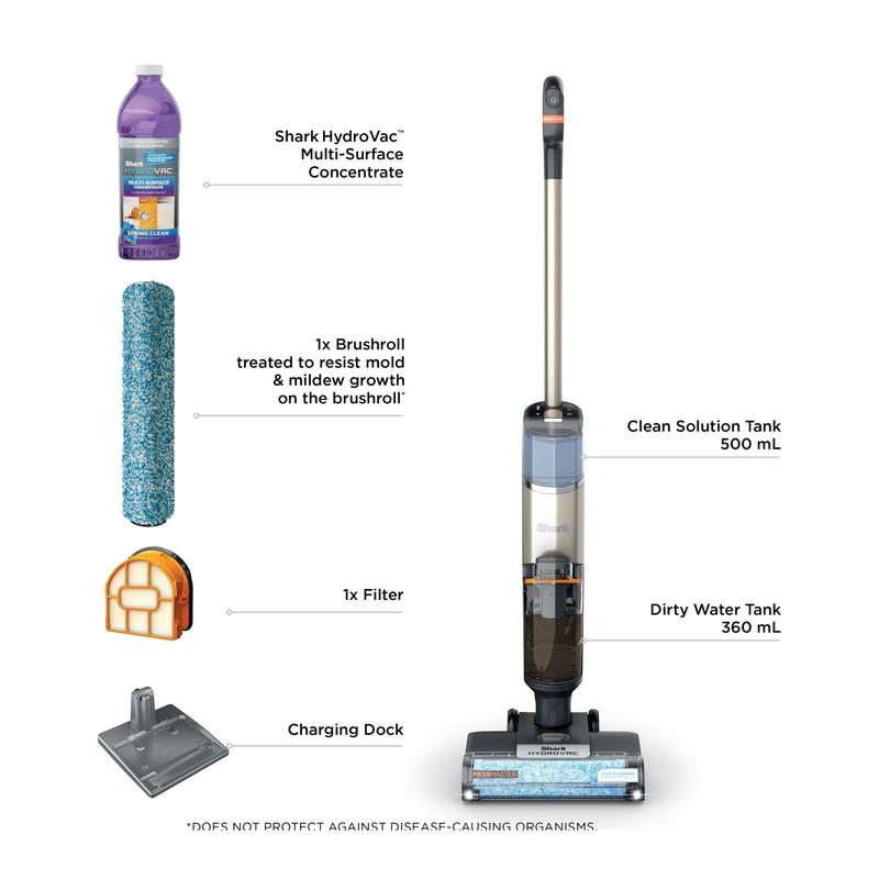 ·Includes Shark HydroVac MessMaster Cordless Multi-Surface Cleaner, 12-oz Multi-Surface Concentrate, antimicrobial brushroll, foam filter, and charging dock