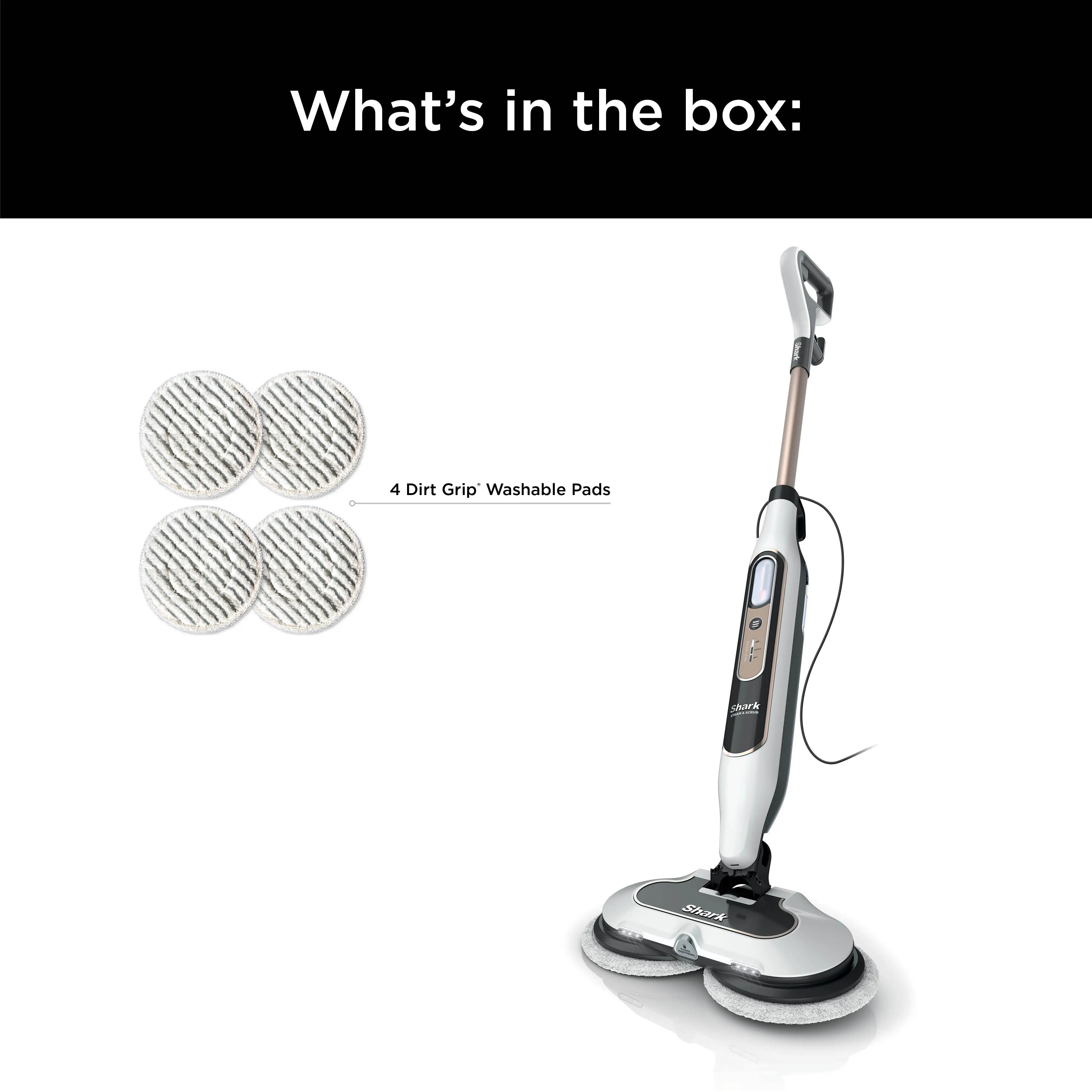 The Shark® Steam & Scrub with Steam Blaster® technology mops, gently scrubs and sanitizes* all at once while removing 99.9% of common household bacteria** using just water. Powerful steam and rotating pads provide up to 2X better stuck-on stain removal vs. a traditional steam mop^. *See sanitization instructions in Owner’s Guide for important details on sanitizing floors. Sanitization studies were conducted under controlled test conditions. **Demonstrated to be effective against Pseudomonas aeruginosa, Staphylococcus aureus, Escherichia coli, Salmonella enterica (typhi), and Klebsiella pneumoniae when used as directed. ^S1000 based on IEC/TC SC 59F (Mustard)