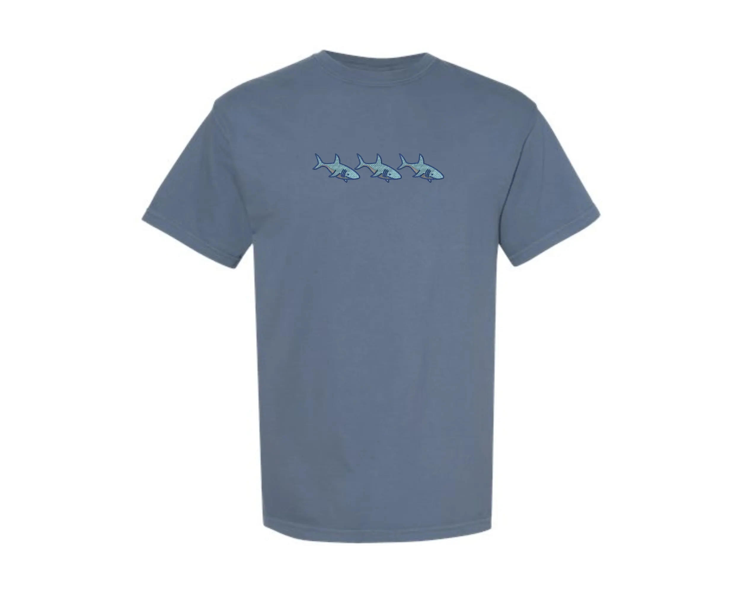 how cute are the sharks 🦈 the sharks will color coordinate with the shirt color you pick just like our jellyfish shirts 🩵🫶🏼 #tshirt #embroideredtshirt #fyp #embroideredshirt #summertshirt #sharkshirt