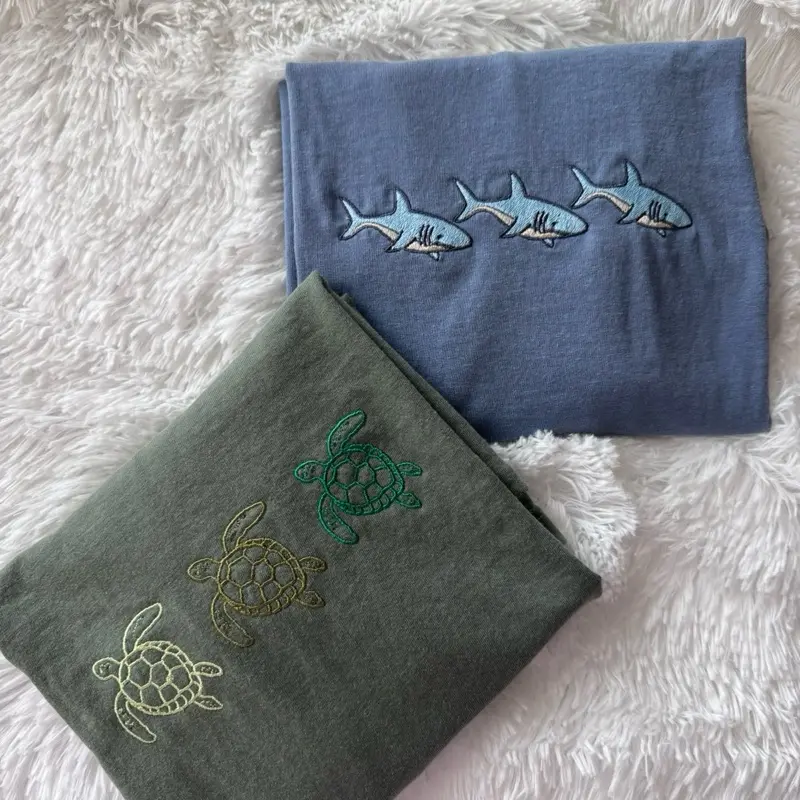new shark & sea turtle shirts out now 🫶🏼☀️ they will color coordinate with the tshirt color you choose!!  #tshirt #embroideredtshirt #fyp #embroideredshirt #summertshirt #sharkshirt #summervibes