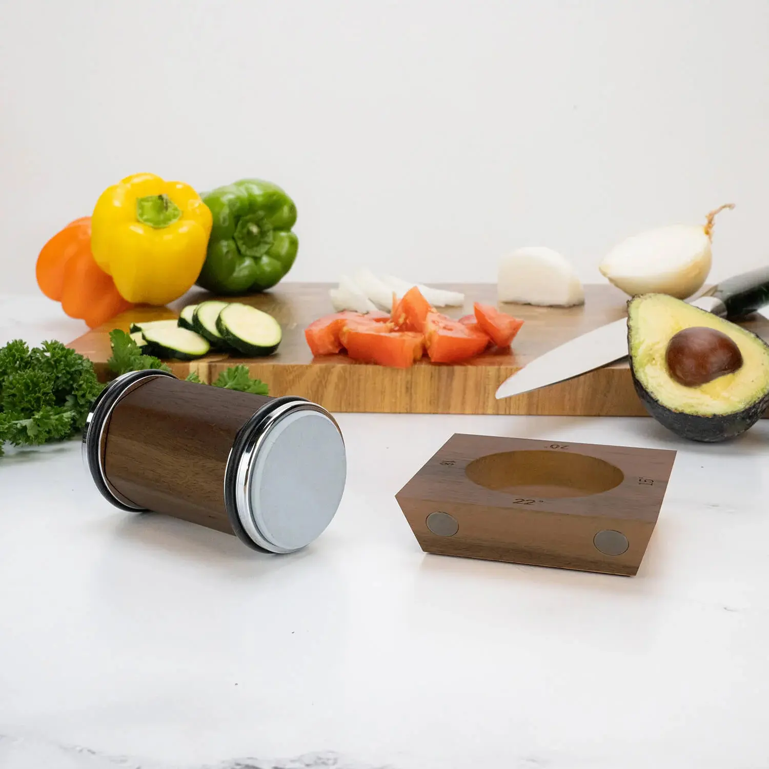 The Rolling Kitchen Knife Sharpener also includes a 4-sided base with 4 different sharpening angles: 15°, 18°, 20°, and 22°. The sharpener conveniently fits inside the center of the base for easy storage of the rolling kitchen knife sharpening system.