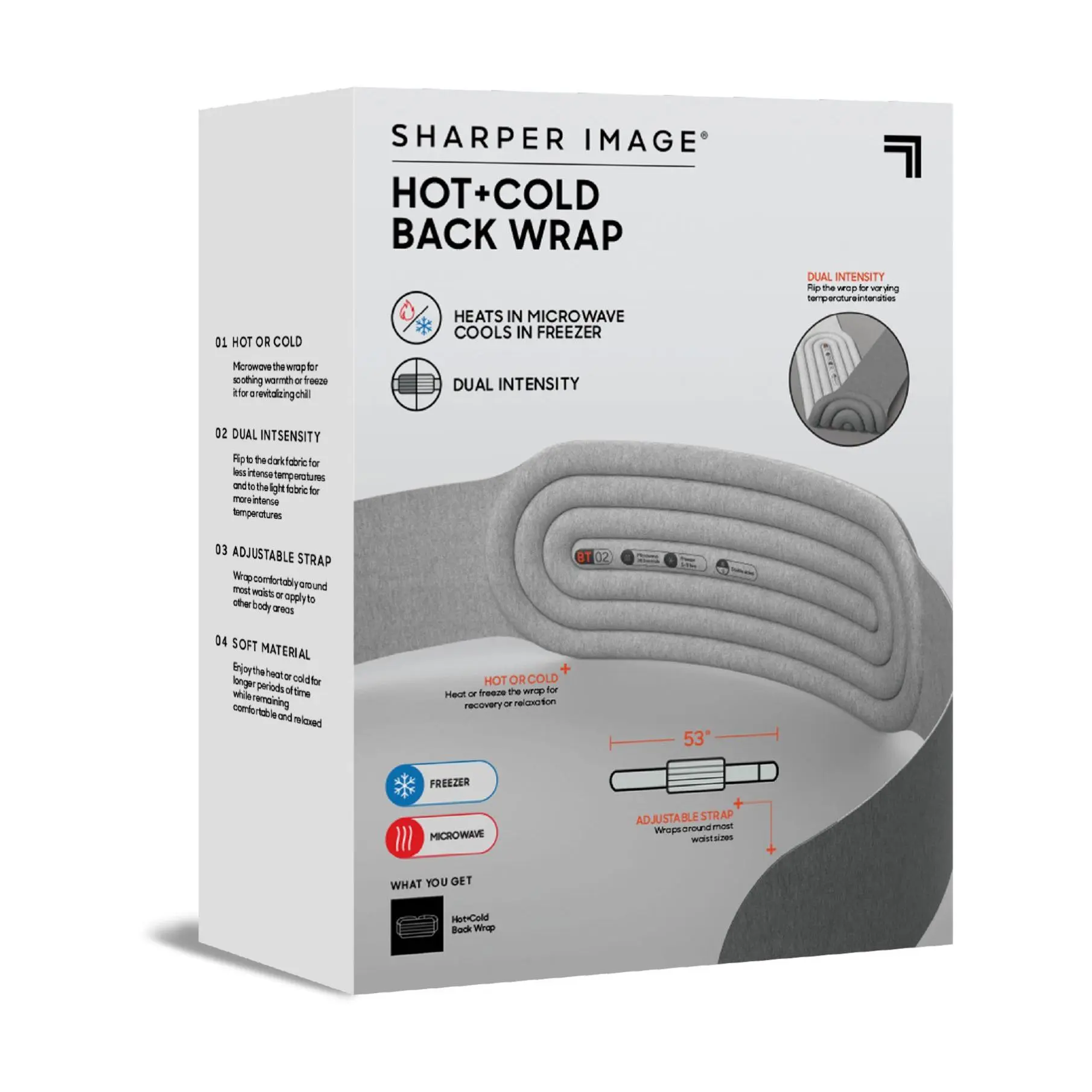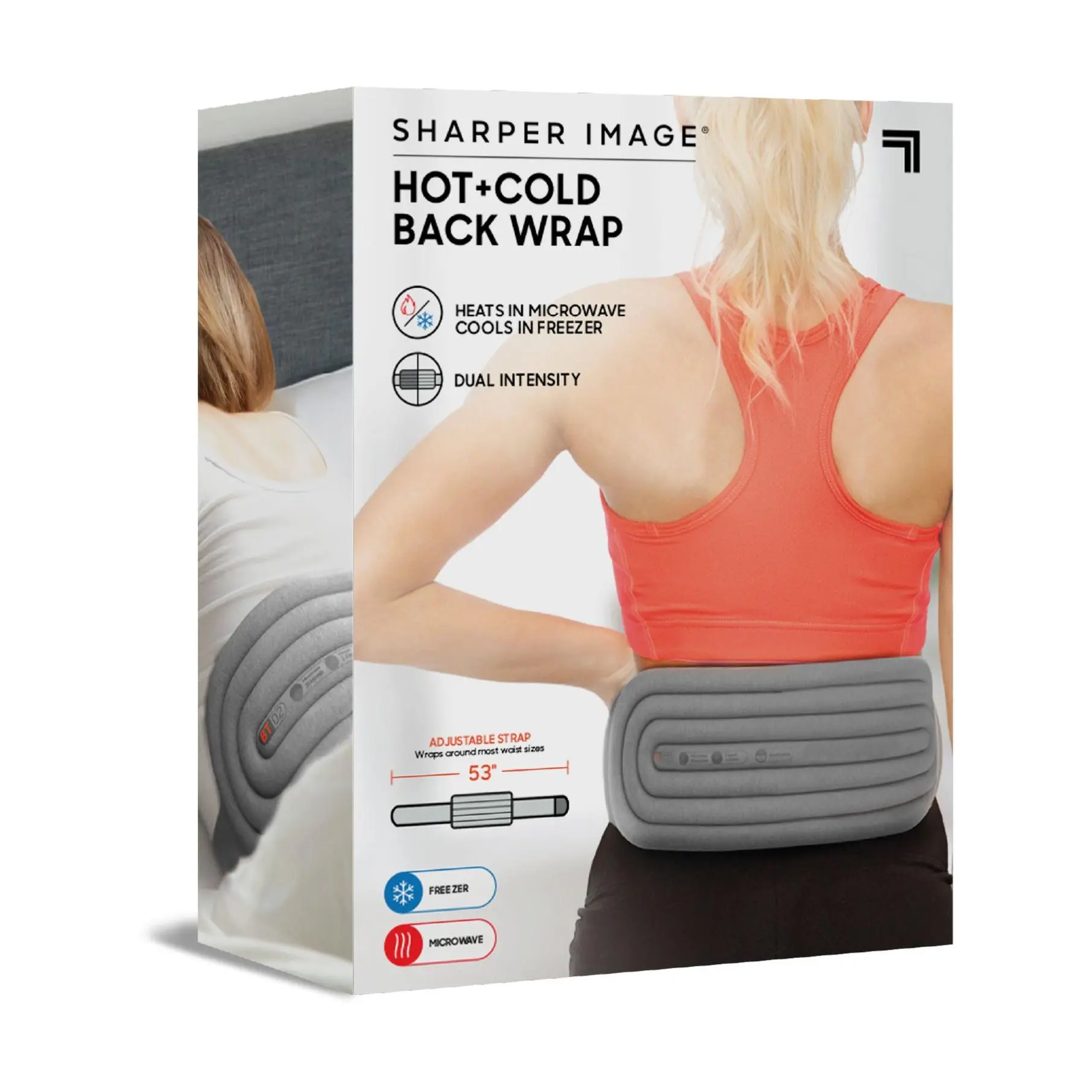 Warm up or cool down with this Sharper Image therapy back wrap. Designed with soft material and an adjustable hook-and-loop closure, the versatile design combines heat and cold therapy, while also providing personalized comfort with dual intensity to adjust the temperature. From Sharper Image.