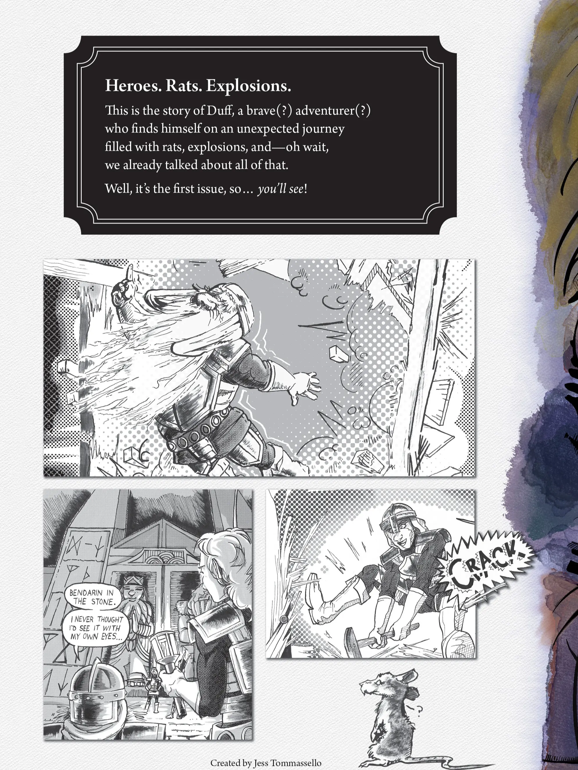 Heroes. Rats. Explosions. This is the story of Duff, a brave(?) adventurer(?) who finds himself on an unexpected journey filled with rats, explosions, and--oh wait, we already talked about all of that. Well, it's the first issue, so... you'll see! Check out Sharpest Sword Issue 1: Rat Bane, a hand-drawn, black-and-white comic and the start of an exciting new fantasy adventure!