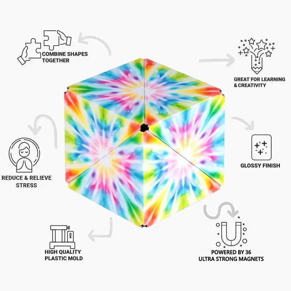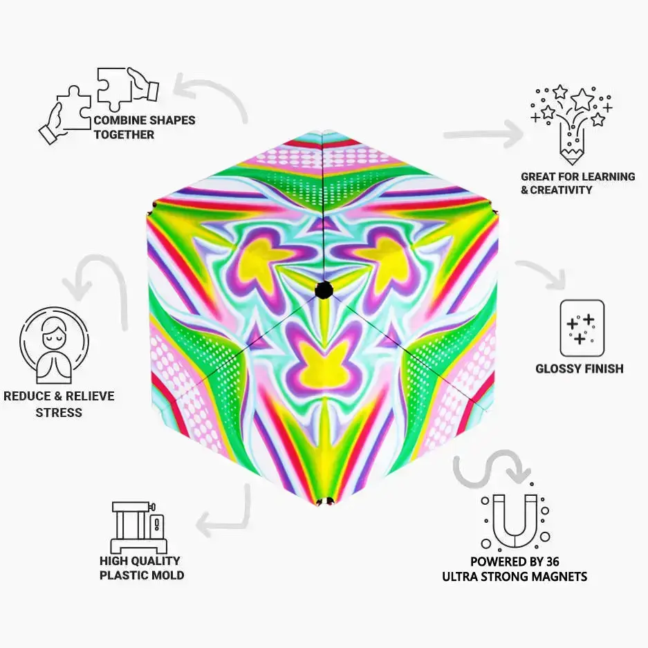 Shashibo cubes are crafted with magnetic technology, allowing them to easily snap into different shapes. The cubes feature vibrant designs and patterns, adding an artistic touch to the interactive experience. The magnetic construction ensures durability and ease of manipulation.