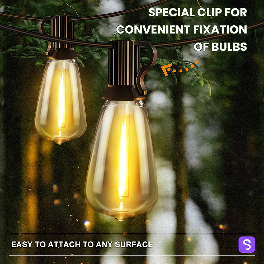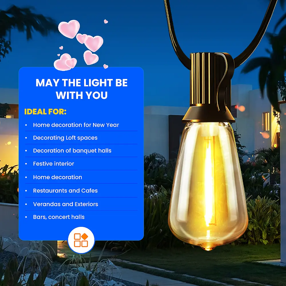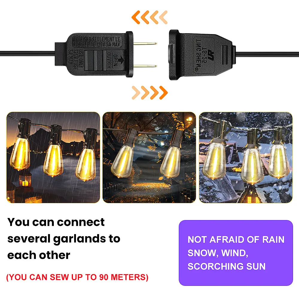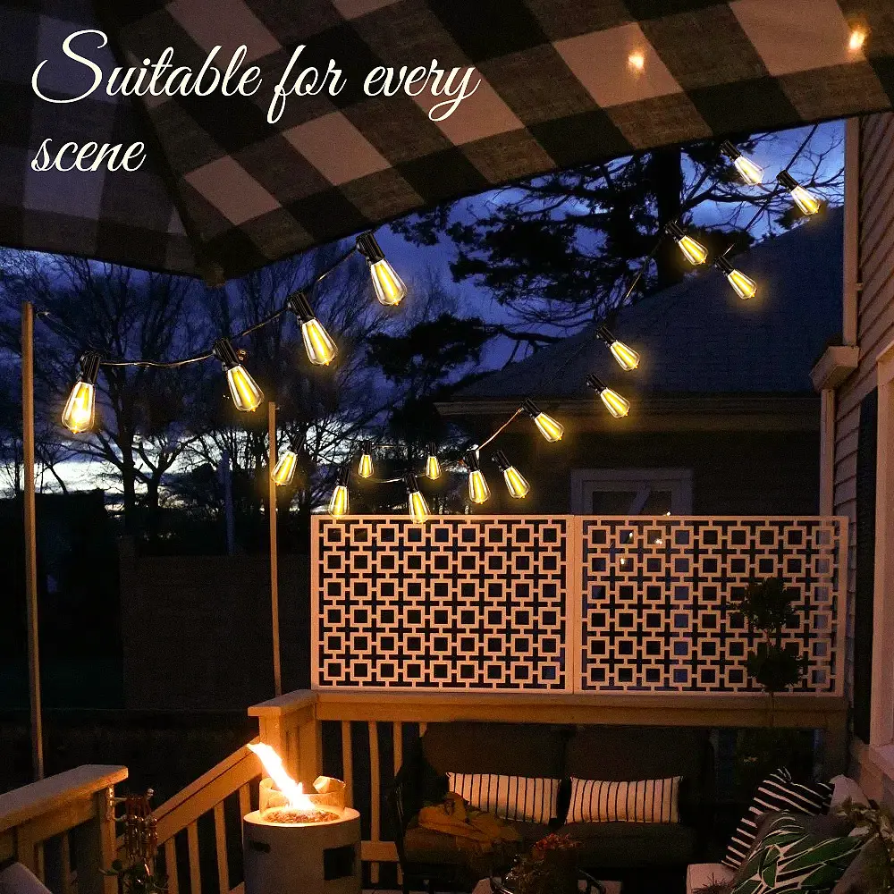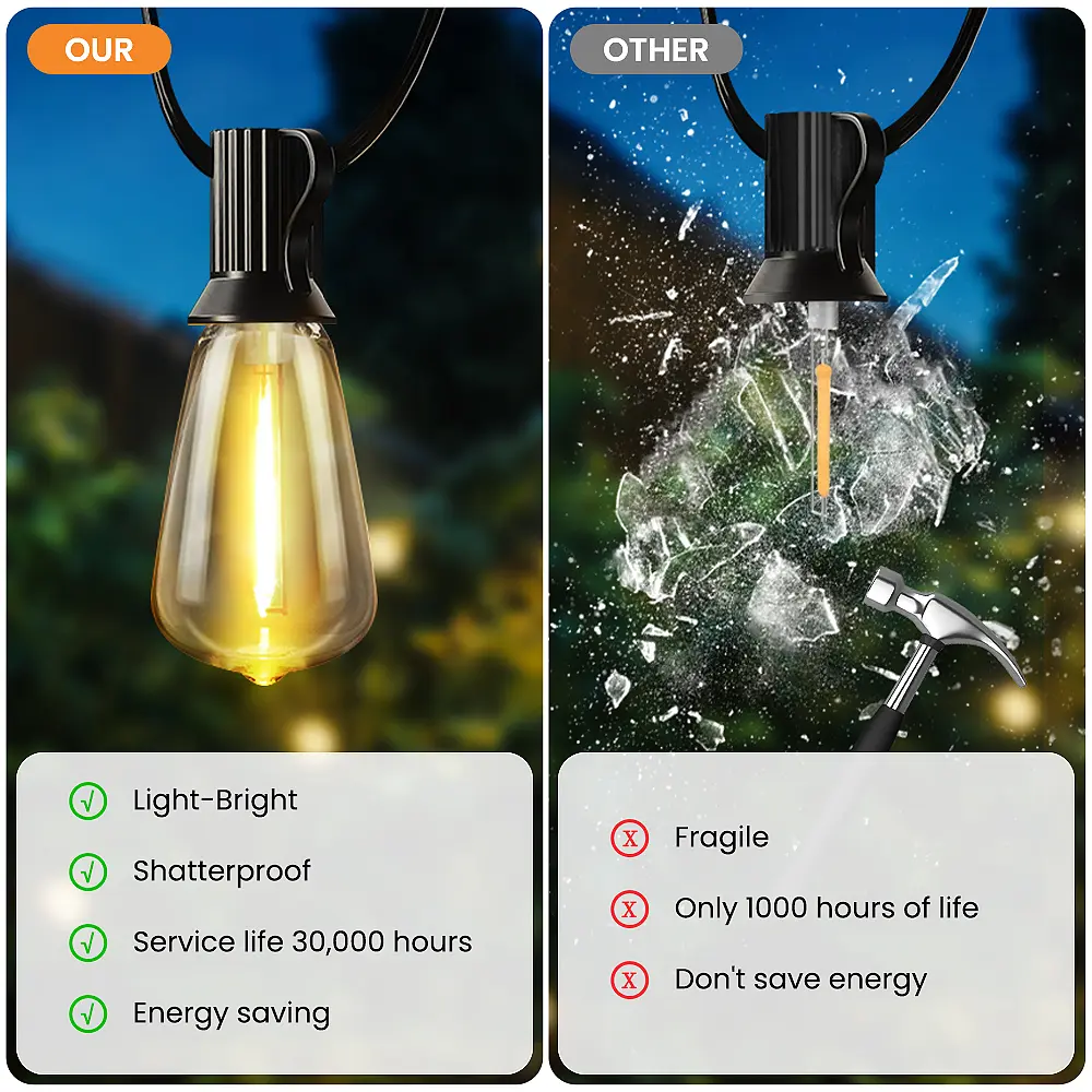 Elevate your outdoor area with our Shatterproof Connectable Outdoor LED Patio Lights. These durable ST38 bulbs and weatherproof design are perfect for backyards, gazebos, porches, and party venues. The warm ambient glow blends functionality with charming vintage aesthetics.
