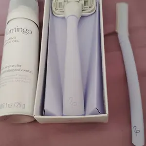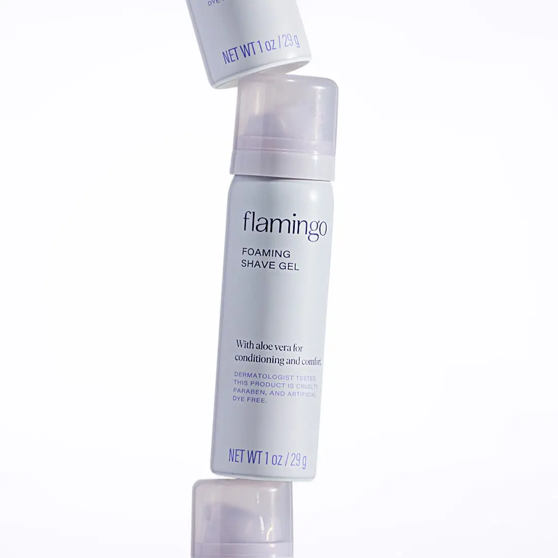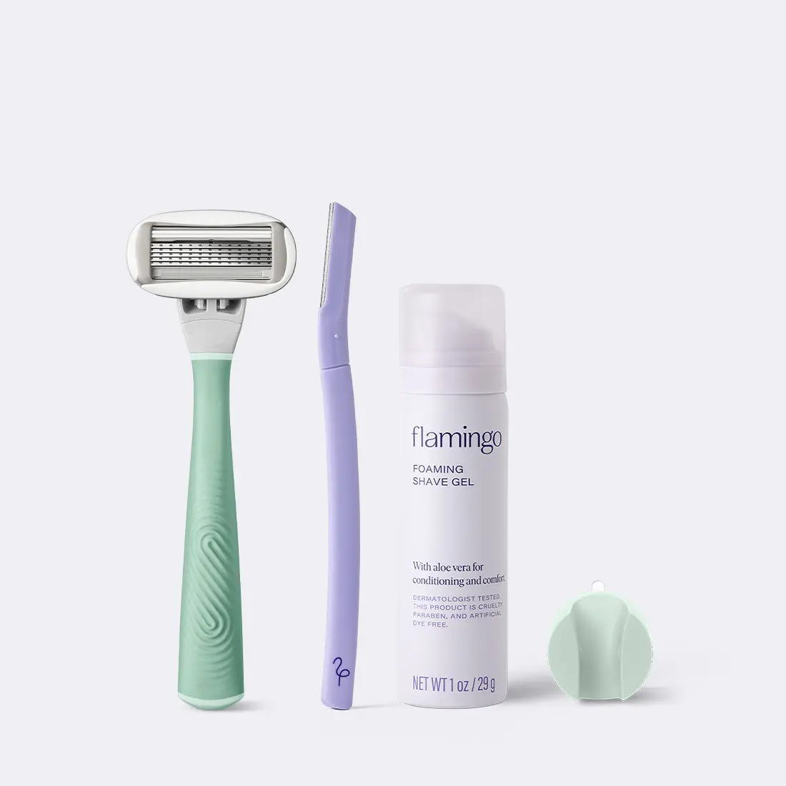If youâre new to Flamingo, this is a great way to try everything you need for a smooth shave, for your body and face. Includes our award-winning Original Razor with five blades and glide strips with aloe and shea butter, a shower holder for handy storage, our pillowy Foaming Shave Gel, and a Disposable Dermaplane Razor to sweep away facial hair and exfoliate skin.