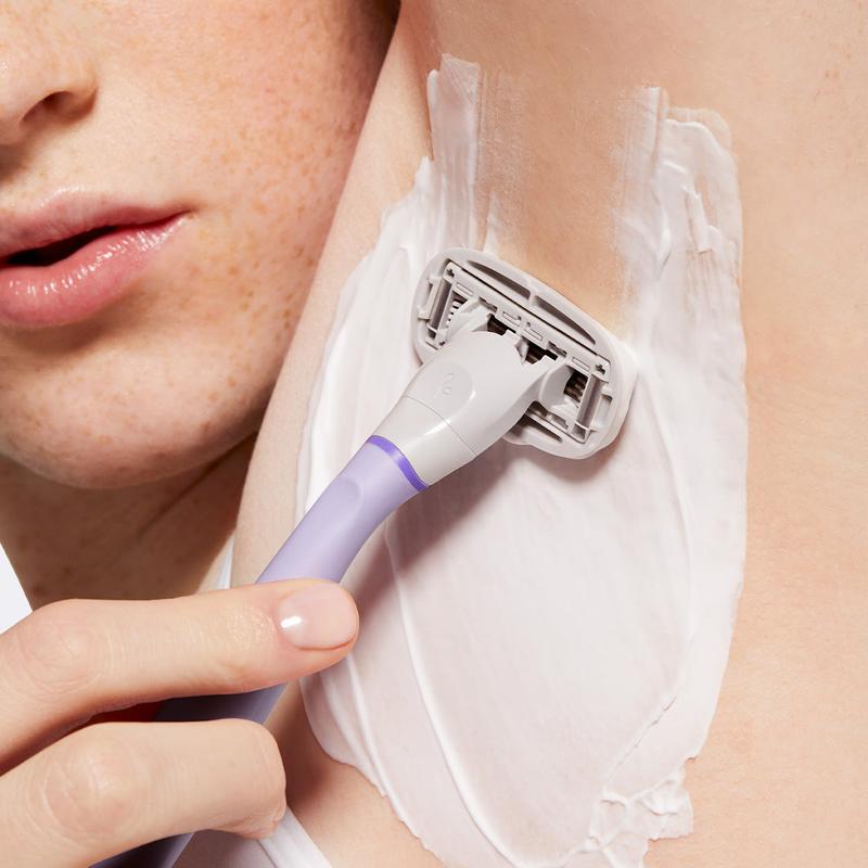 Our razor features five sharp blades, a 360° comfort system to help protect skin from irritation, a flexible hinge to hug every curve, and a weighted ergonomic handle.