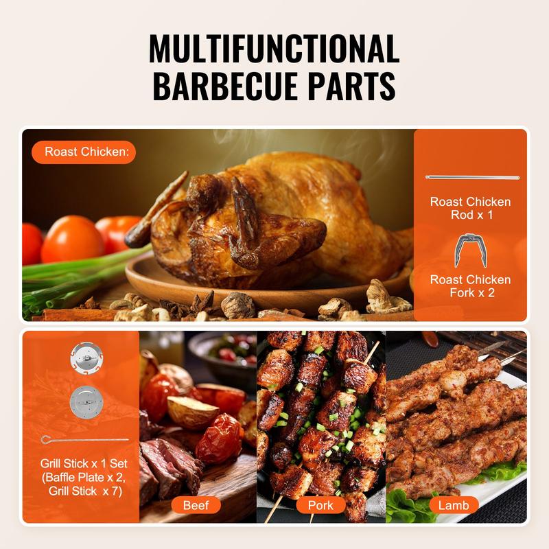 ·Multifunctional Parts: To accommodate different types of meat, we've equipped the gyro rotisserie with various components, such as a set for roasting chicken (including 2 chicken forks and 1 chicken rod) and a complete skewer kit (featuring 2 baffle plates and 7 grill sticks). This multifunctional setup allows for grilling chicken, kebabs, and more.