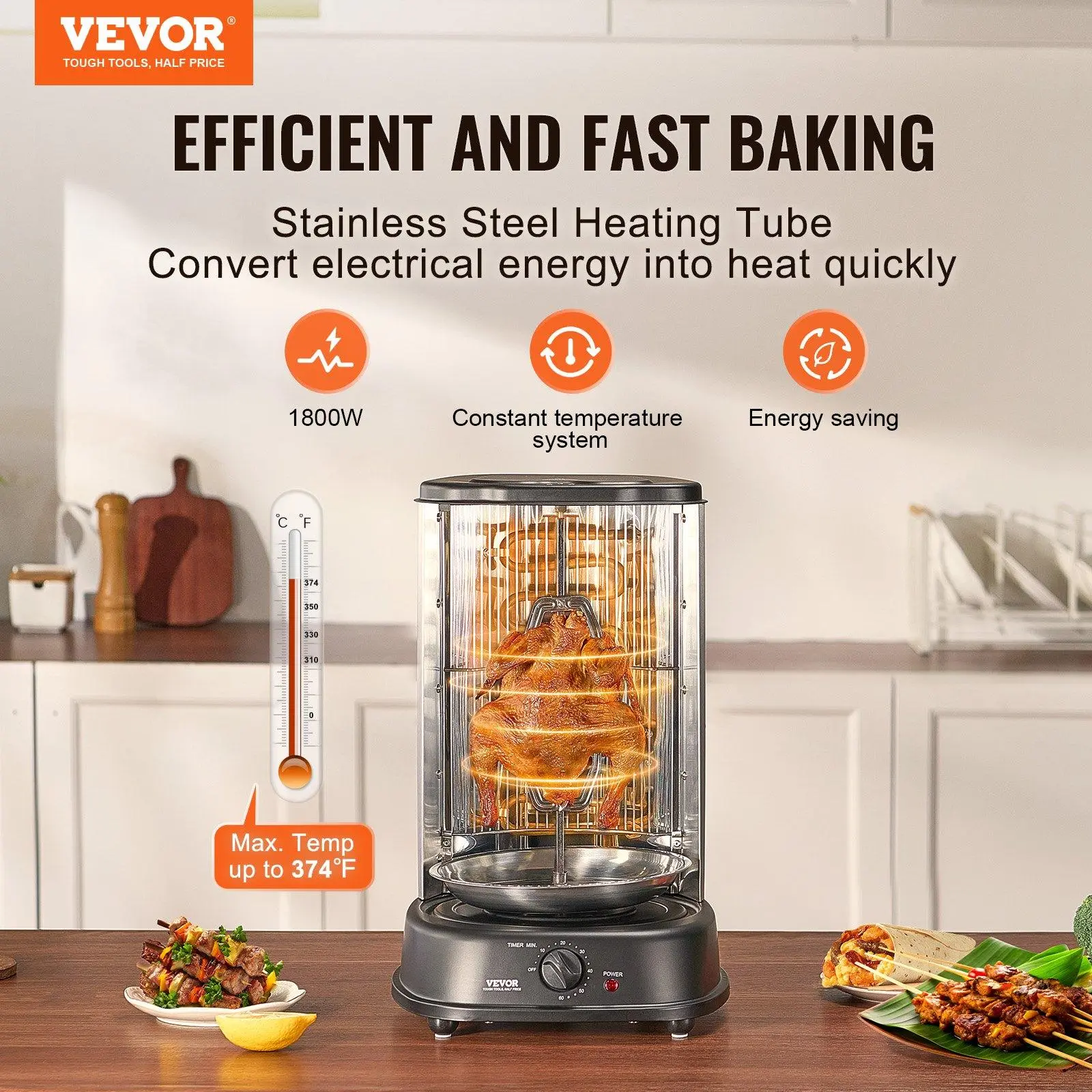 Equipped with a stainless steel heating tube, the shawarma grill machine quickly reaches a maximum temperature of 374°F (190°C). The 360° rotating design helps you prepare tasty grilled meats evenly and efficiently.