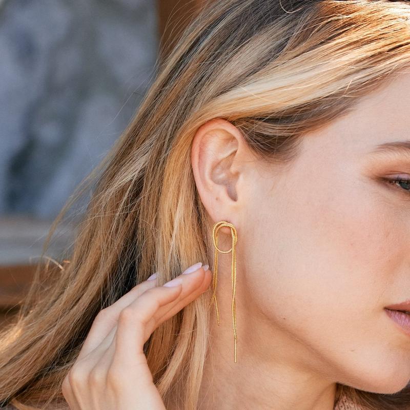Add a delightful and playful twist to your outfit with our stunning Shea Earrings! These unique earrings feature an open knot design that creates a sense of movement, effortlessly catching the eye and drawing attention to your style. The elegant linear drop design adds a touch of sophistication, making them the perfect accessory for both casual outings and special occasions. With a secure post closure, these earrings ensure comfortable wear throughout the day, making them a must-have addition to your jewelry collection.