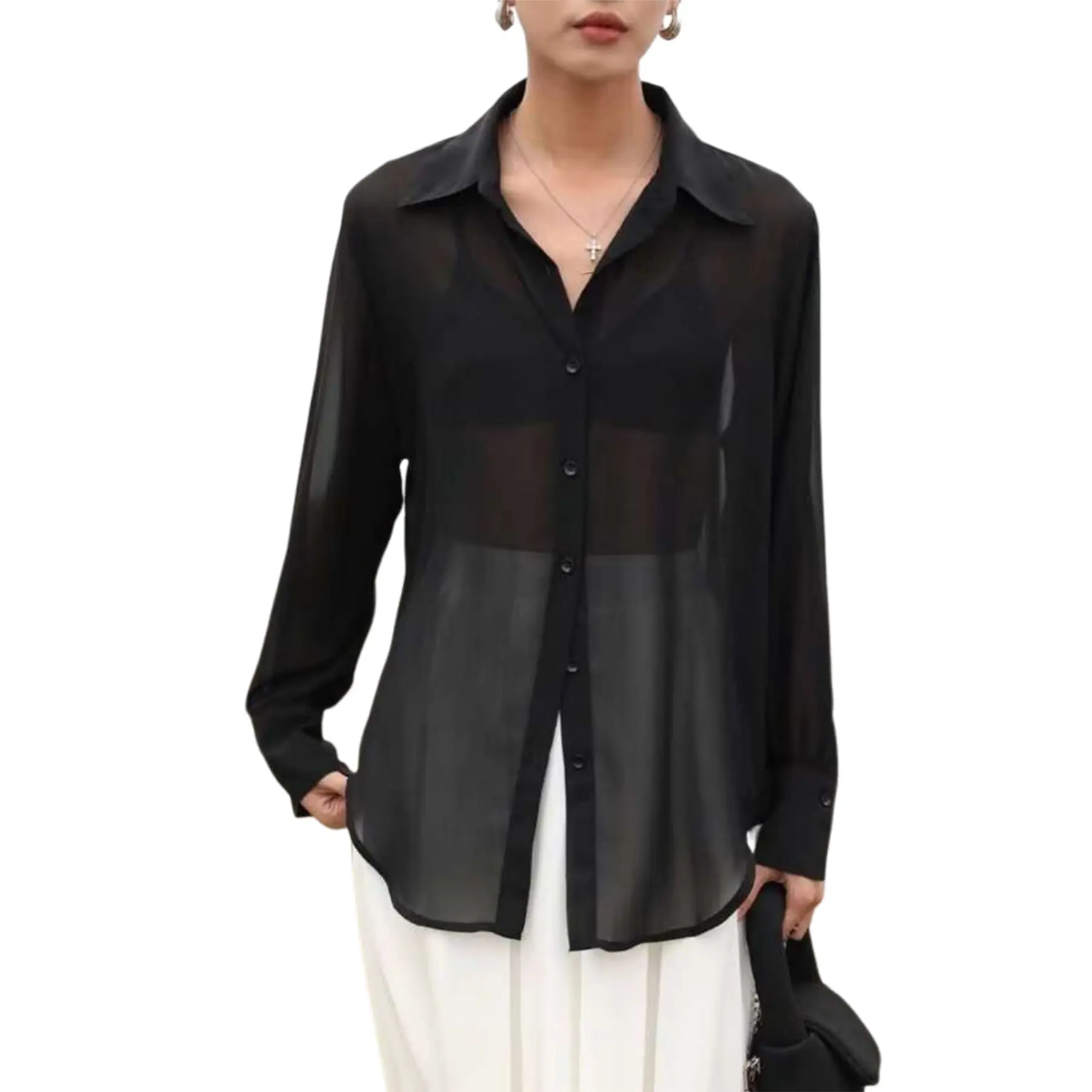 Features: Sexy sheer button down blouses for women, sheer mesh, button front, long sleeve, collar neck, tunic longline, blouse shirt tops, midi length can cover your hip, spring summer fall shirts top, sexy clubwear, trendy streetwear