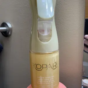 Love this sunscreen! Smells amazing! Beautiful light shimmer. Love the spray bottle it comes in. It also works great! Was at the beach all day yesterday and no sunburn, skin feels great after a day in the sun!