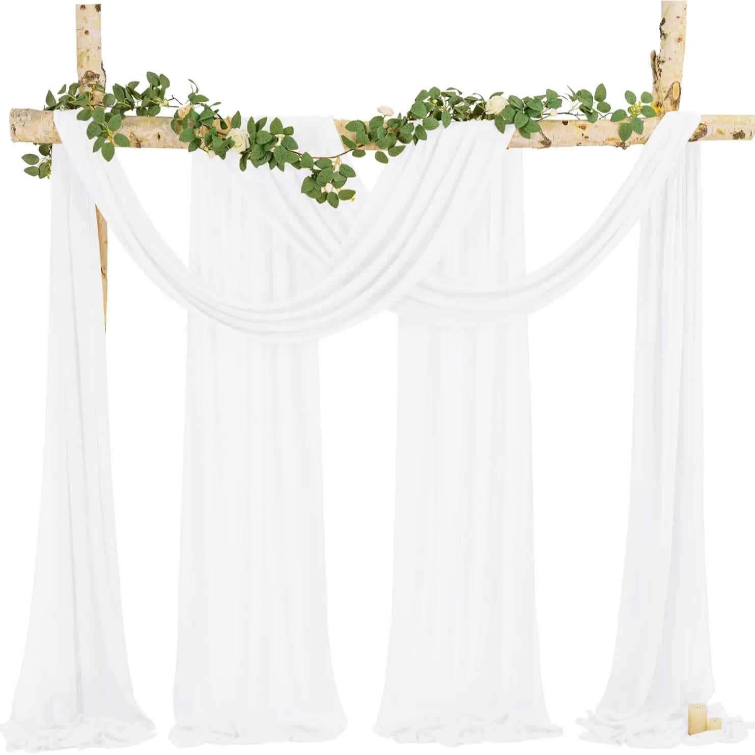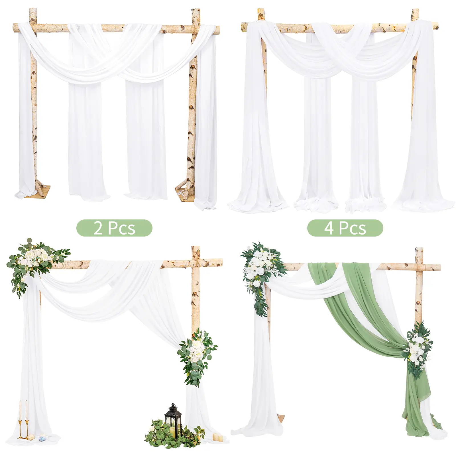 You can get 4 piece sheer arch drapes. each panel is 28 inches wide and 20 feet long. Our wedding arch drapes are long enough to decorate any size arch. Decorating your wedding with romantic arch drapes will definitely bring you unexpected surprises