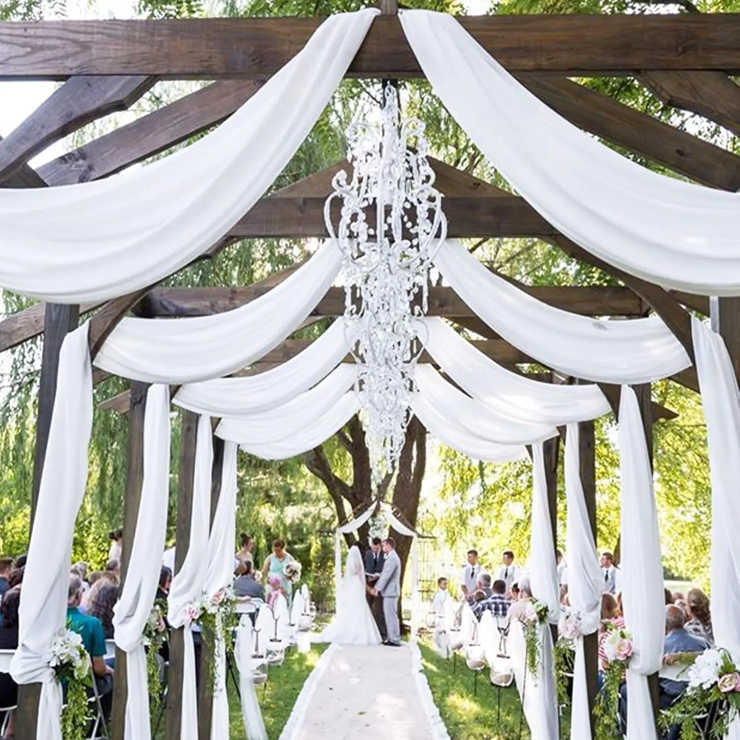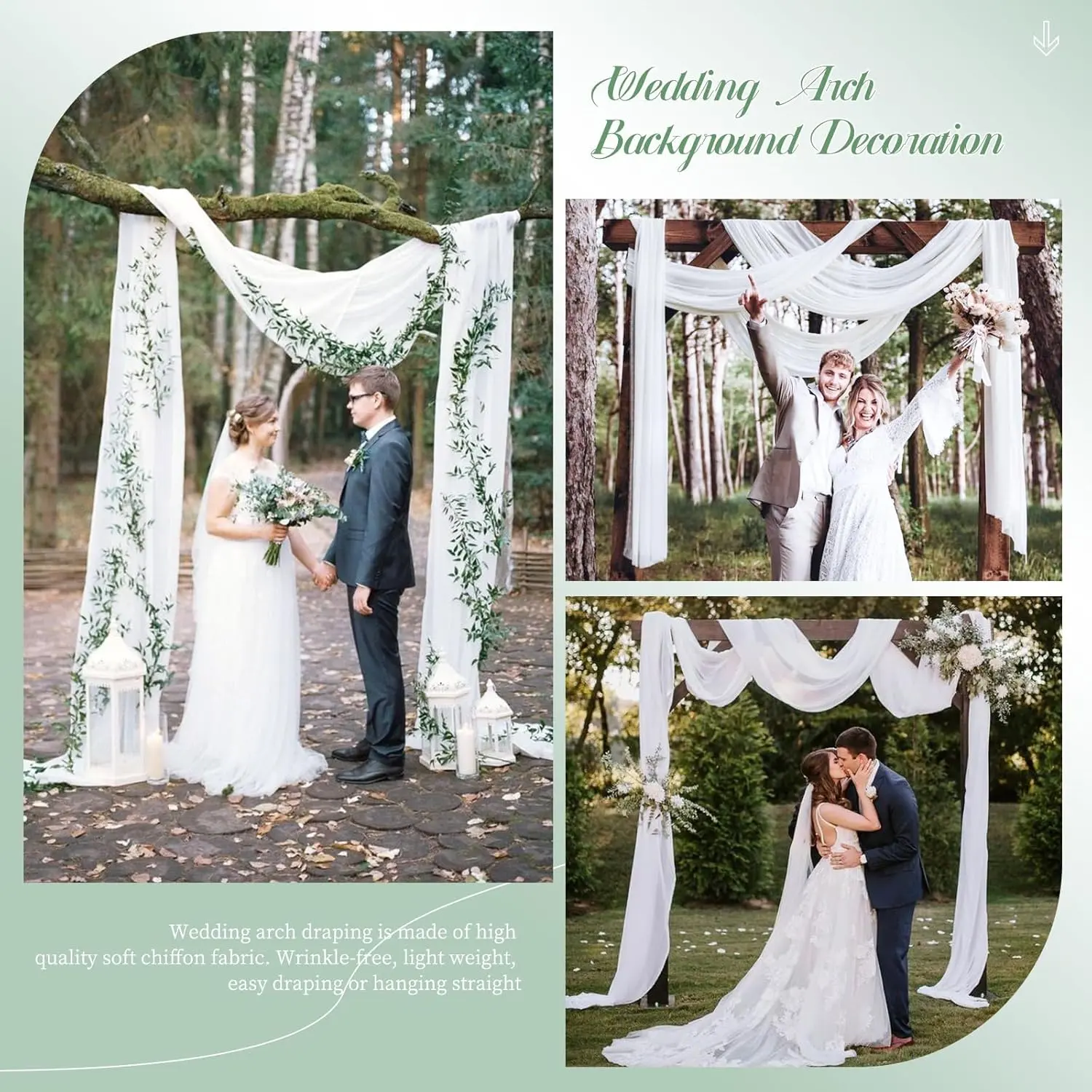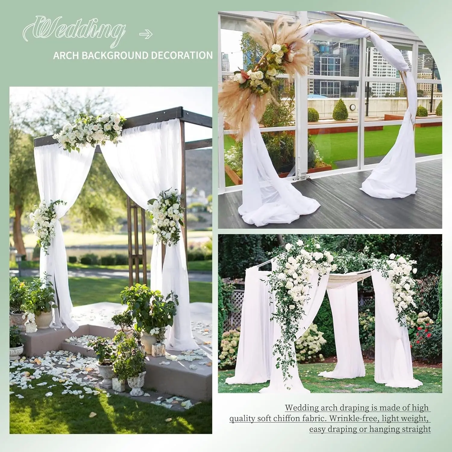 【Easy to Clean】sheer wedding arch drapes are easy to care for. Best washed gently by hand or in a washing machine using a laundry bag. Do not bleach, lay it flat or hang it to dry. Use a steam iron and the wrinkles will disappear and can be used repeatedly.