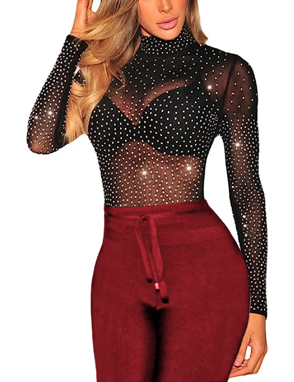 ·Black stretchy sheer mesh fabric made.this womens tops is lightweight and breathable for comfy wearing;The sheer mesh material creates a seductive and alluring look;The shiny rhinestones will let your lover unfortunate