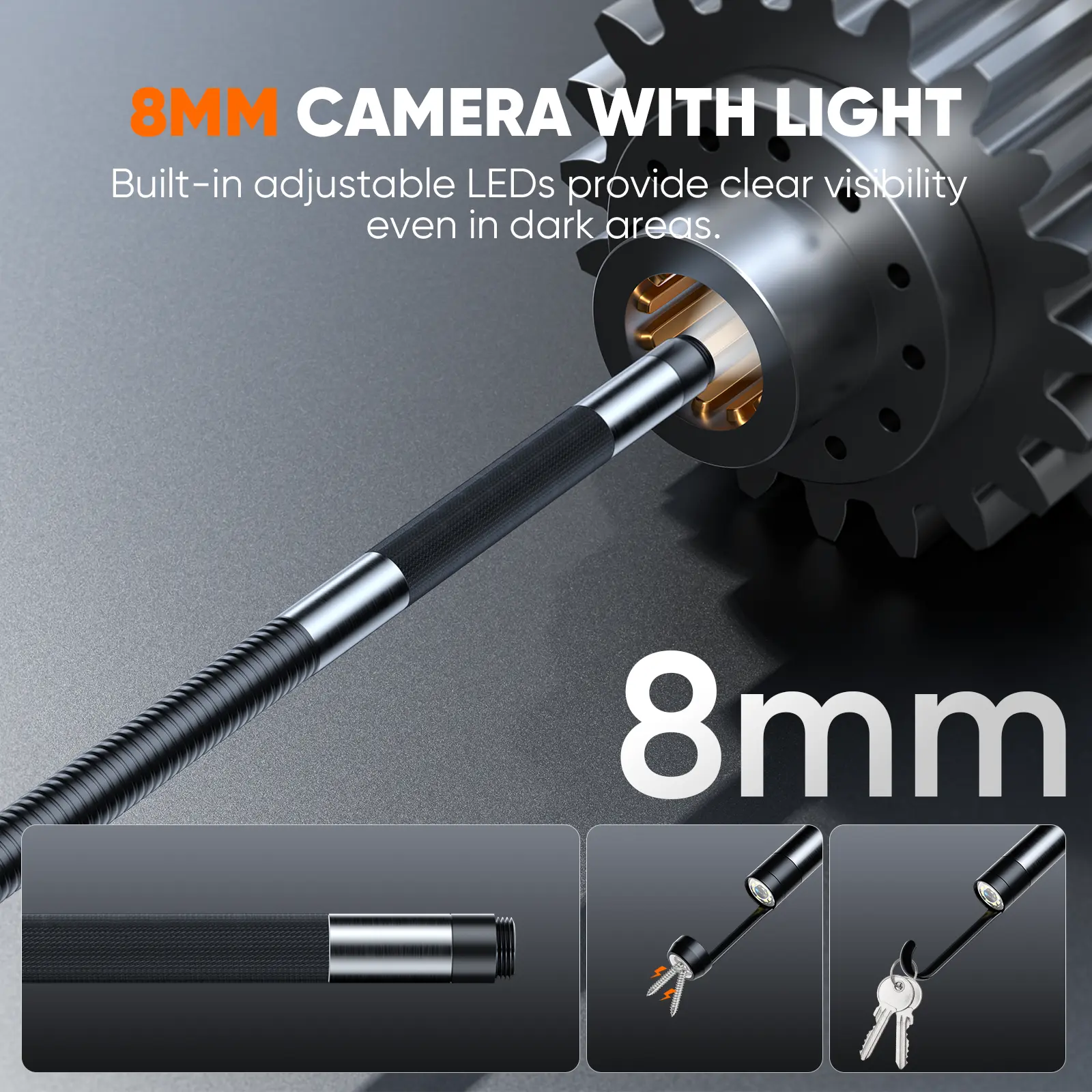 Featuring a professional 8mm inspection lens, the borescope easily fits into narrow spaces while maintaining flexibility. The 2.0MP camera with 2x digital zoom captures detailed close-ups, and 8 adjustable LED lights ensure bright, accurate visuals in even the darkest environments.