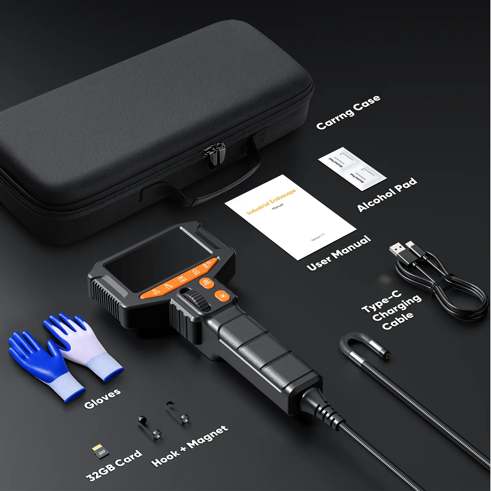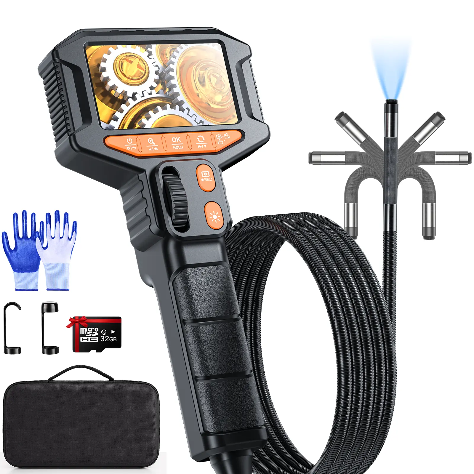 Comes with a 32GB TF card and a 2000mAh rechargeable lithium battery providing up to 3.5 hours of continuous use. Everything is neatly stored in a durable carrying case for easy portability — ensuring your borescope is always organized, protected, and ready for any job.