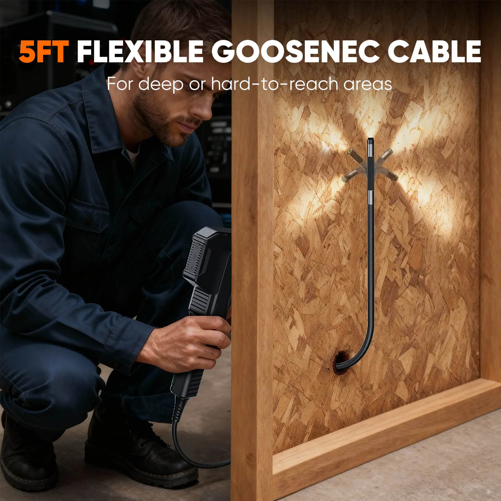 Experience effortless precision with our semi-rigid two-way articulation design, allowing you to easily maneuver the camera in tight or complex spaces. The built-in LED lights enhance visibility in dark areas, while the one-hand operation design makes inspections of high-temperature, humid, or hard-to-reach areas simpler and safer.