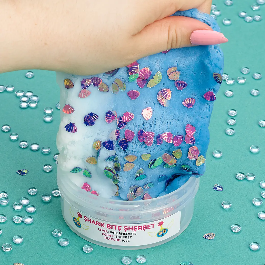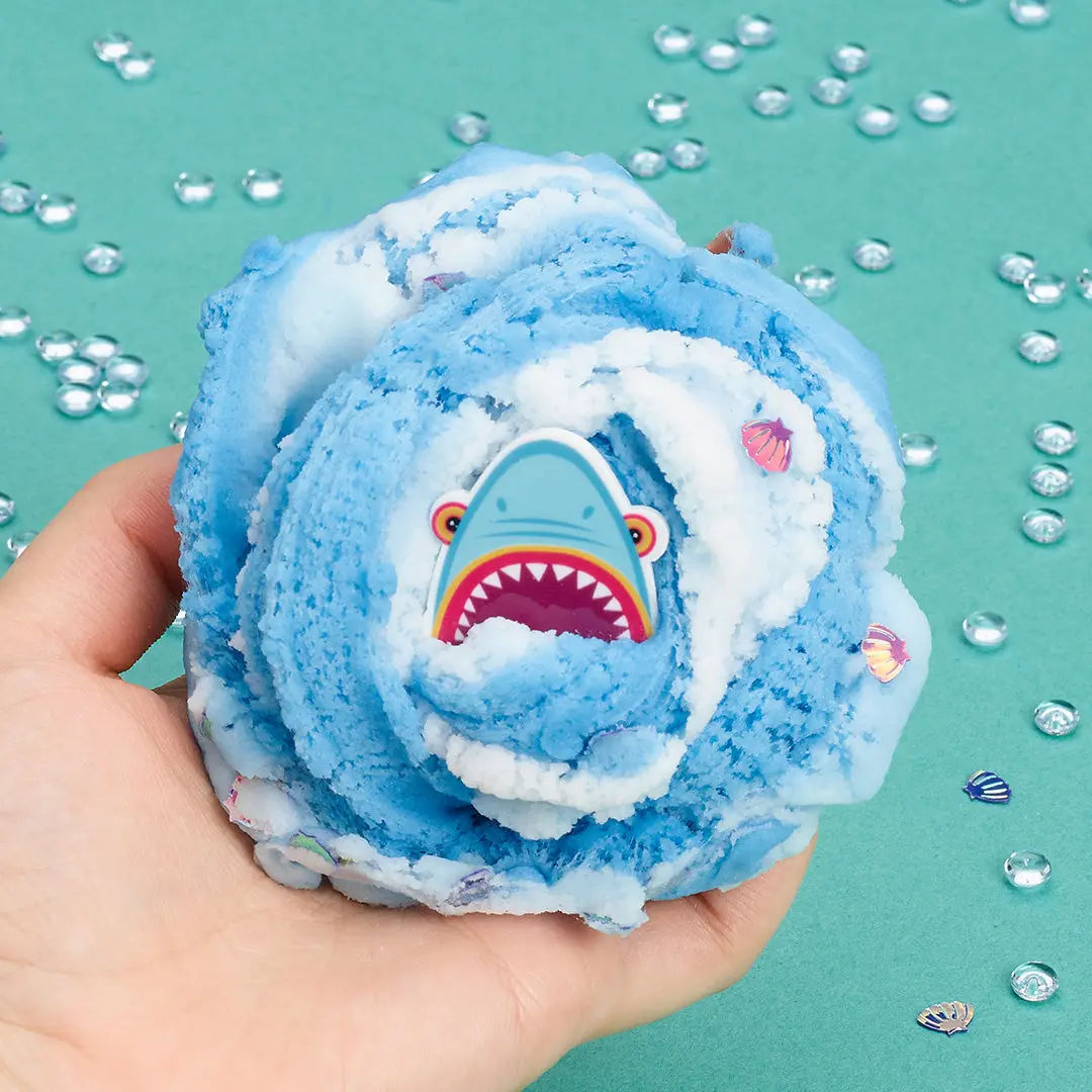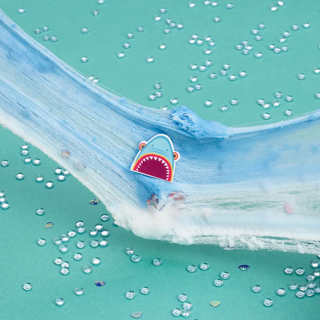 Topped with glittery shells and a large shark charm, this slime has serious bite.ย