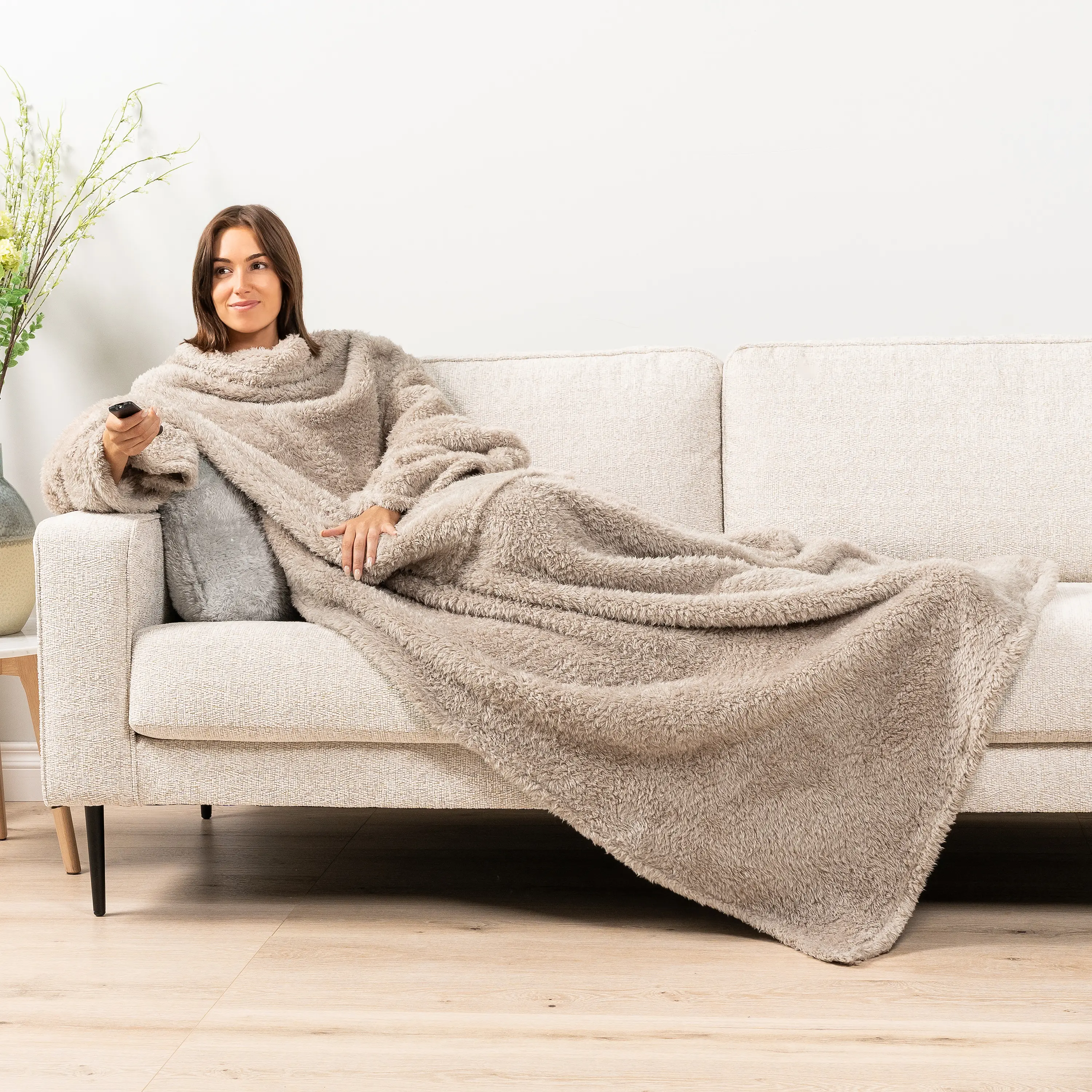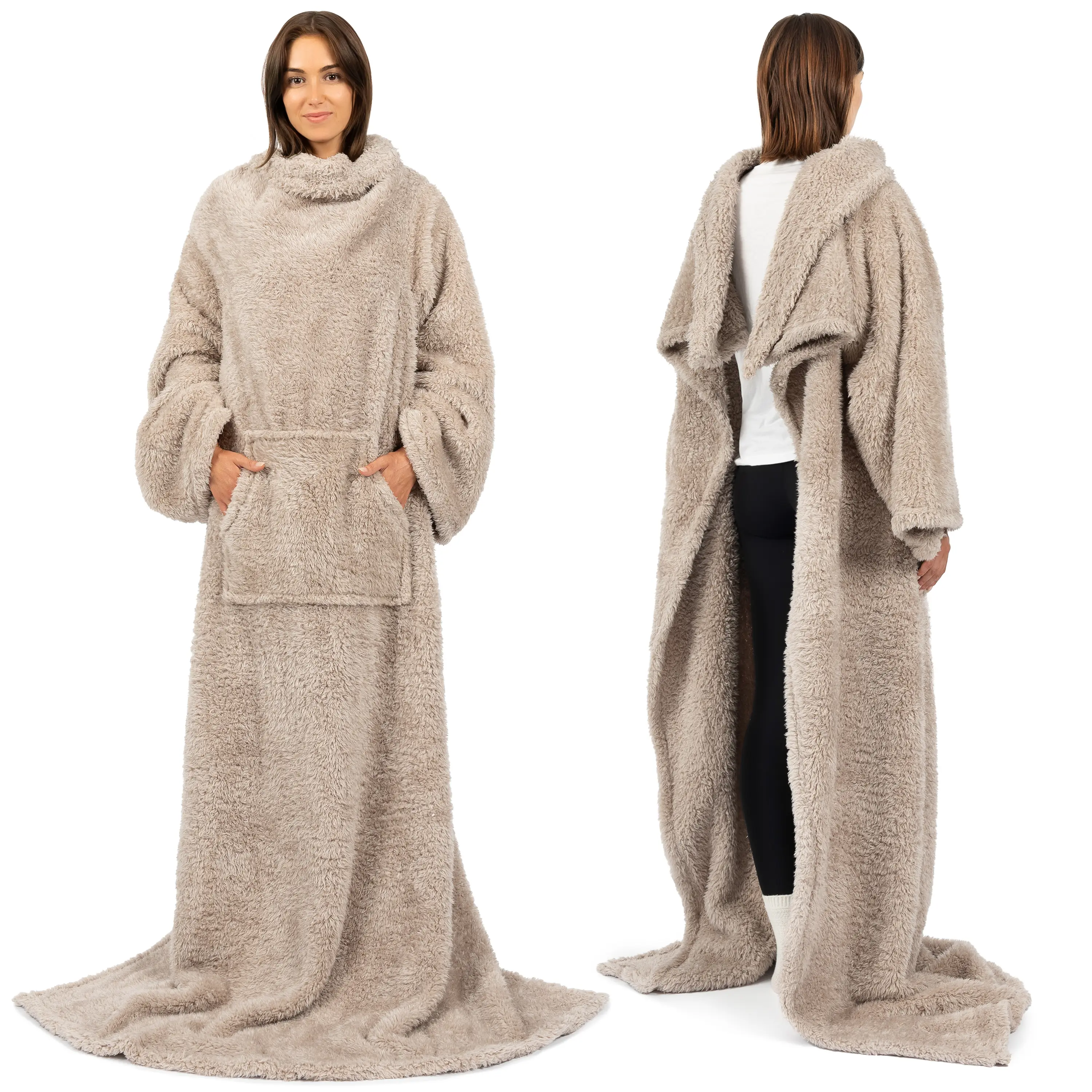 SHERPA FLEECE WEARABLE BLANKET WITH SLEEVES: Fluffy and Shaggy, this sleeved blanket is soft, lightweight, yet durable. The fuzzy plush teddy sherpa fabric makes it cozy with an elegant touch. Keep you warm and comfortable while watching TV, lounging at home, gaming, or reading a book on couch sofa bed.