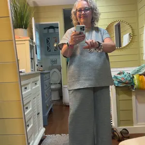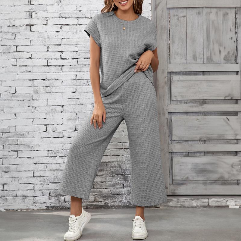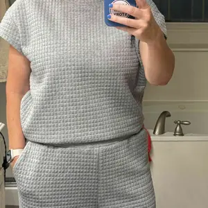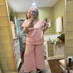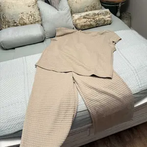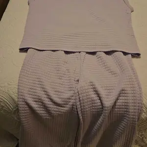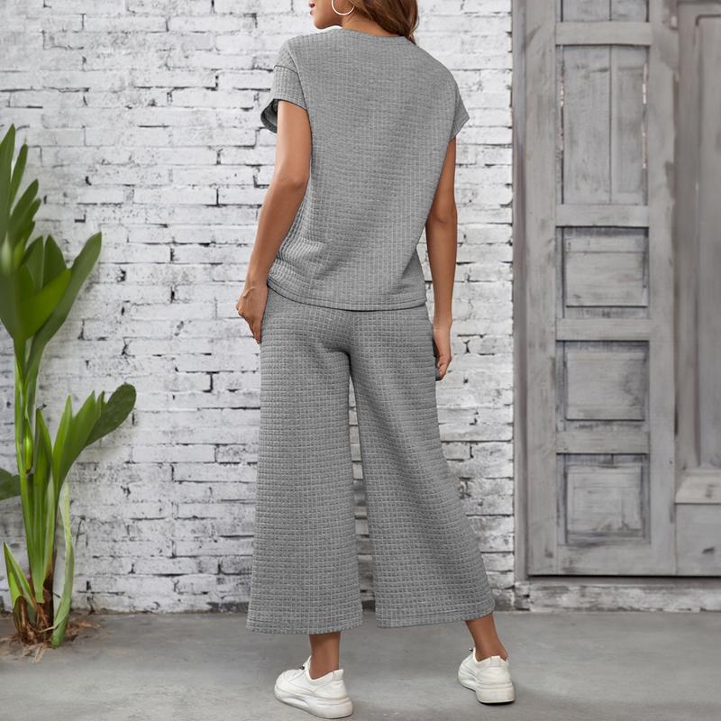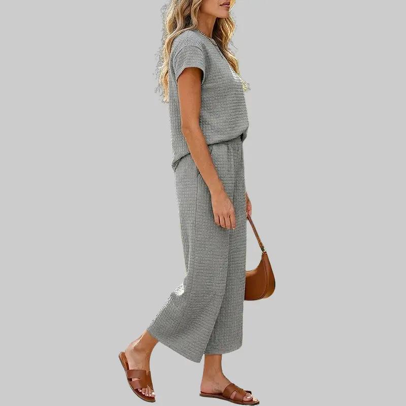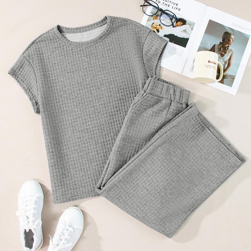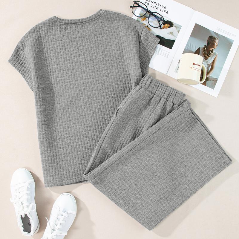 ·The image showcases the two-piece set, including a pullover top and wide leg sweatpants, with side pockets and a quilted style.